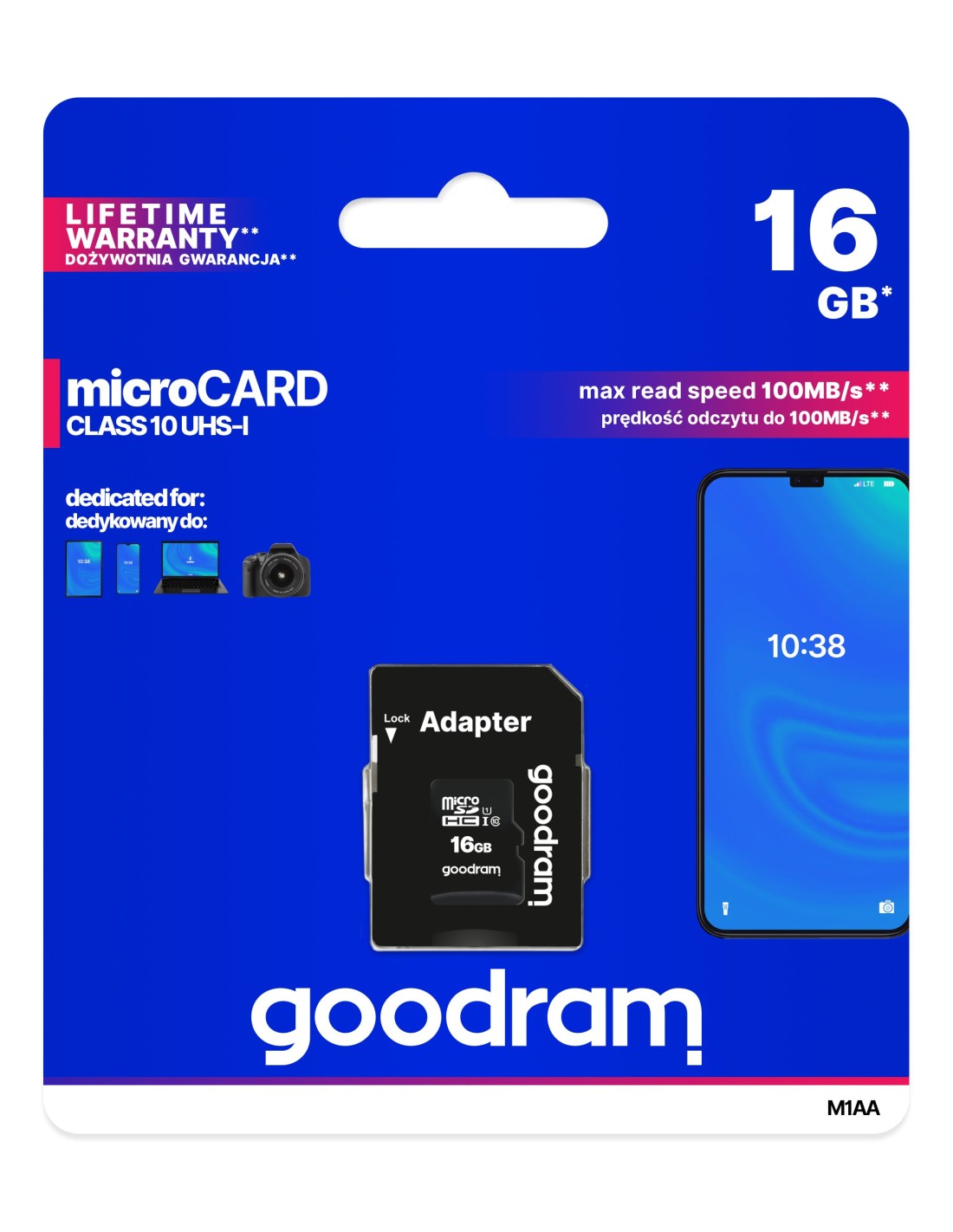 GOODRAMGoodram M1AA, 16 GB, MicroSDHC, Clase 10, UHS-I, 100 MB/s, 10 MB/s