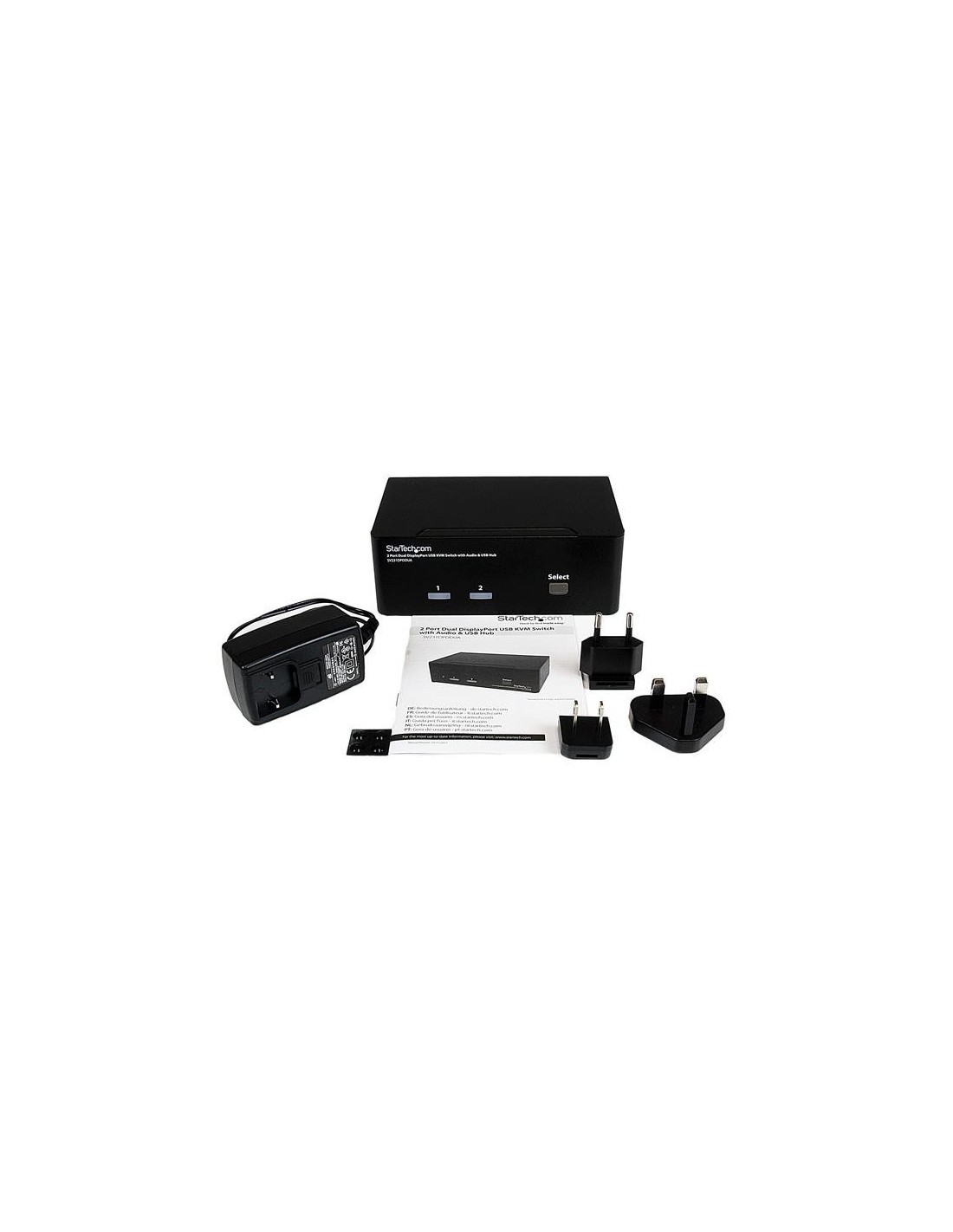 StarTech.com Conmutador Switch KVM - 2 puertos USB 2.0 - Audio Vídeo DisplayPort 2 Monitores. Tipo de puerto de teclado: USB, Tipo de puerto de ratón: USB, Tipo de puerto de vídeo: DisplayPort. Tipo HD: 4K Ultra HD, Máxima resolución: 3840 x 2400 Pixeles, Número de usuarios: 1 usuario(s). Color del producto: Negro, Material de la carcasa: Acero, Certificación: CE, FCC, REACH, TAA. Voltaje de entrada: 110 - 240 V, Corriente de entrada: 0.8 A, Voltaje de salida: 12 V. Certificados de conformidad: RoHS