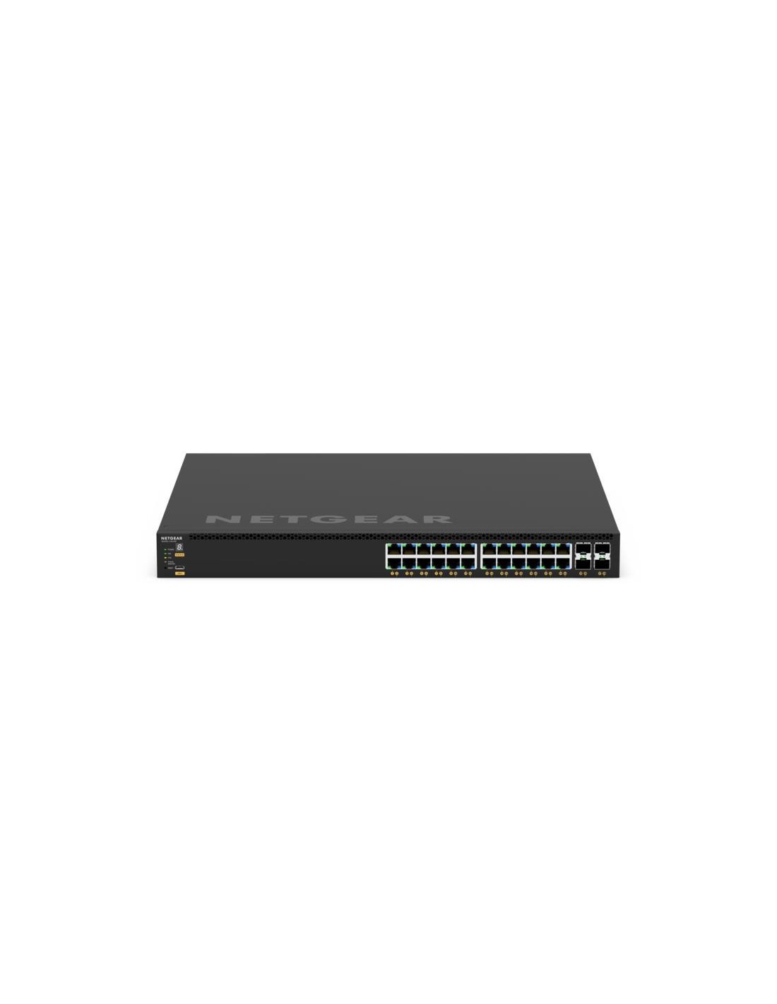 NETGEAR GSM4328-100AJS. Tipo de interruptor: Gestionado, Capa del interruptor: L3. Puertos tipo básico de conmutación RJ-45 Ethernet: Gigabit Ethernet (10/100/1000), Cantidad de puertos básicos de conmutación RJ-45 Ethernet: 24, Número de módulos SFP+ instalados: 4. Tabla de direcciones MAC: 16000 entradas, Capacidad de conmutación: 128 Gbit/s. Estándares de red: IEEE 802.1D, IEEE 802.1Q, IEEE 802.1ab, IEEE 802.1p, IEEE 802.1s, IEEE 802.1v, IEEE 802.1w, IEEE.... Energía sobre Ethernet (PoE). Montaje en rack, Factor de forma: 1U