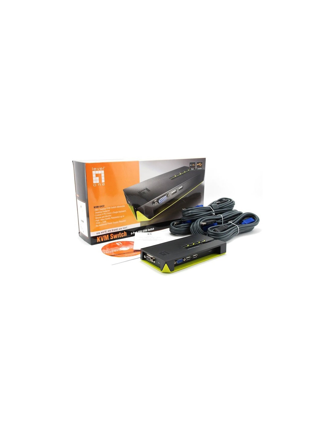 LevelOne Switch KVM de 4 puertos USB. Tipo de puerto de teclado: USB, Tipo de puerto de ratón: USB, Tipo de puerto de vídeo: VGA. Máxima resolución: 2048 x 1536 Pixeles, Intervalo de escaneado: 25,35,45,55,50,40,10,15,20,30,60 s. Color del producto: Negro, Verde, Material de la carcasa: Plástico. Ancho: 72 mm, Profundidad: 164 mm, Altura: 26 mm. Ancho del paquete: 195 mm, Profundidad del paquete: 85 mm, Altura del paquete: 370 mm