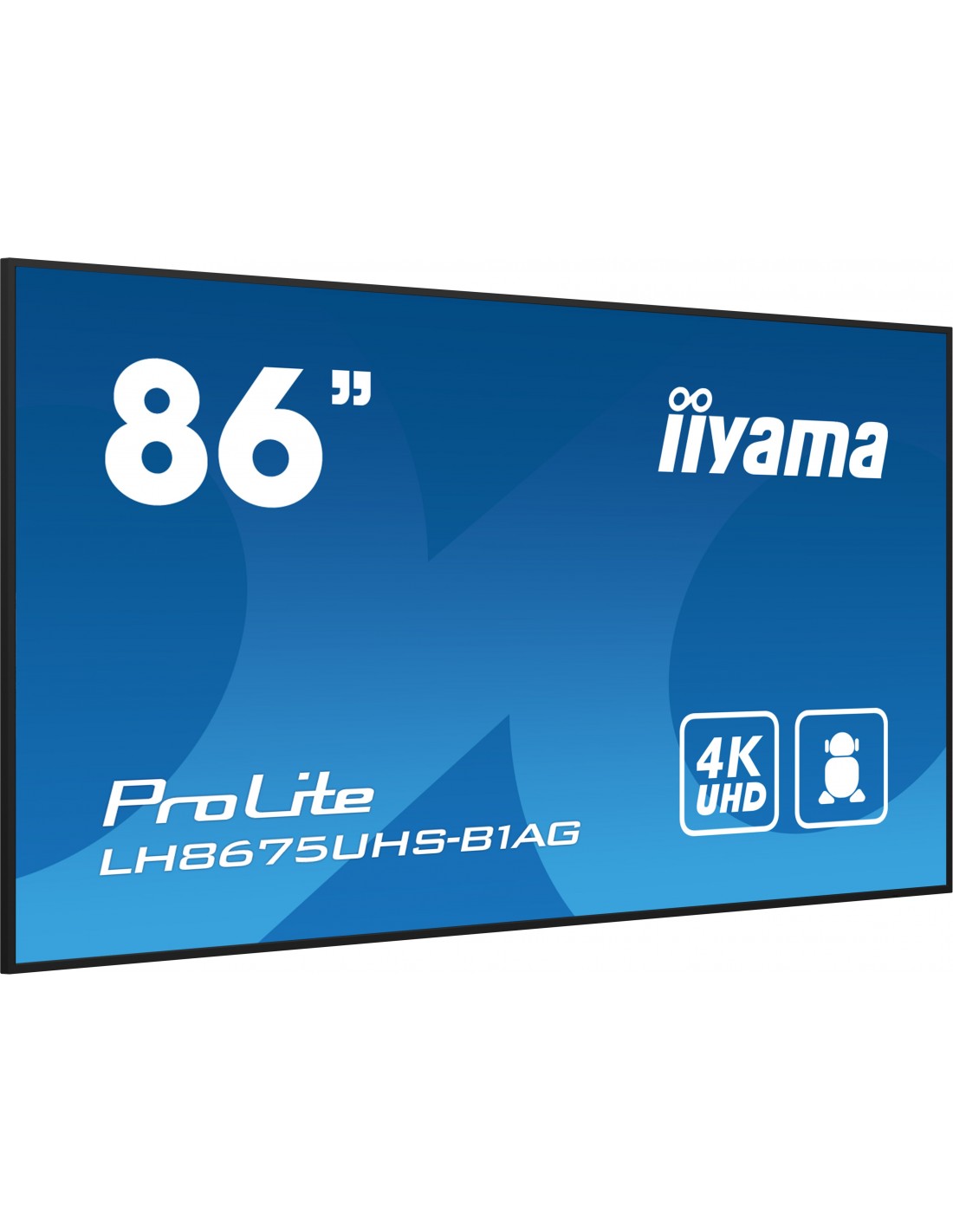iiyama ProLite. Diseño de producto: Pantalla plana para señalización digital. Diagonal de la pantalla: 2,17 m (85.6"), Tecnología de visualización: LCD, Resolución de la pantalla: 3840 x 2160 Pixeles, Brillo de pantalla: 500 cd / m², Tipo HD: 4K Ultra HD. Wifi. Horas de funcionamiento (horas/días): 24/7. Sistema operativo instalado: Android 11. Color del producto: Negro