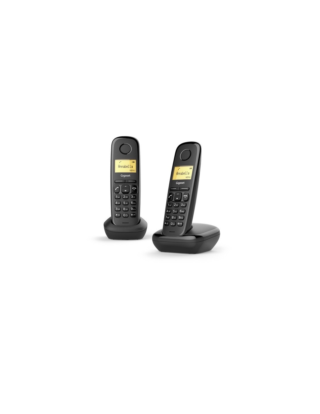 Gigaset A170 Duo. Tipo: Teléfono DECT/analógico, Tipo de auricular: Terminal inalámbrico, Rango máximo en interiores: 50 m, Rango máximo en exteriores: 300 m. Capacidad de lista de direcciones: 50 entradas. Identificador de llamadas. Diagonal de la pantalla: 3,81 cm (1.5"). Color del producto: Negro. Número de teléfonos móviles incluidos: 2