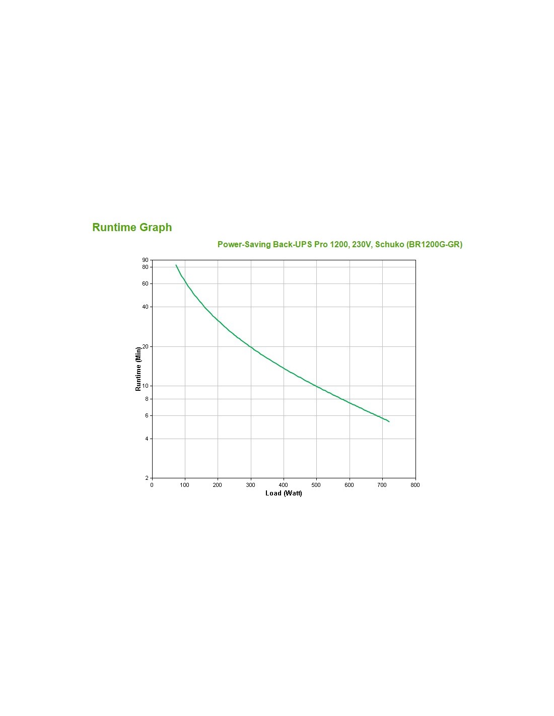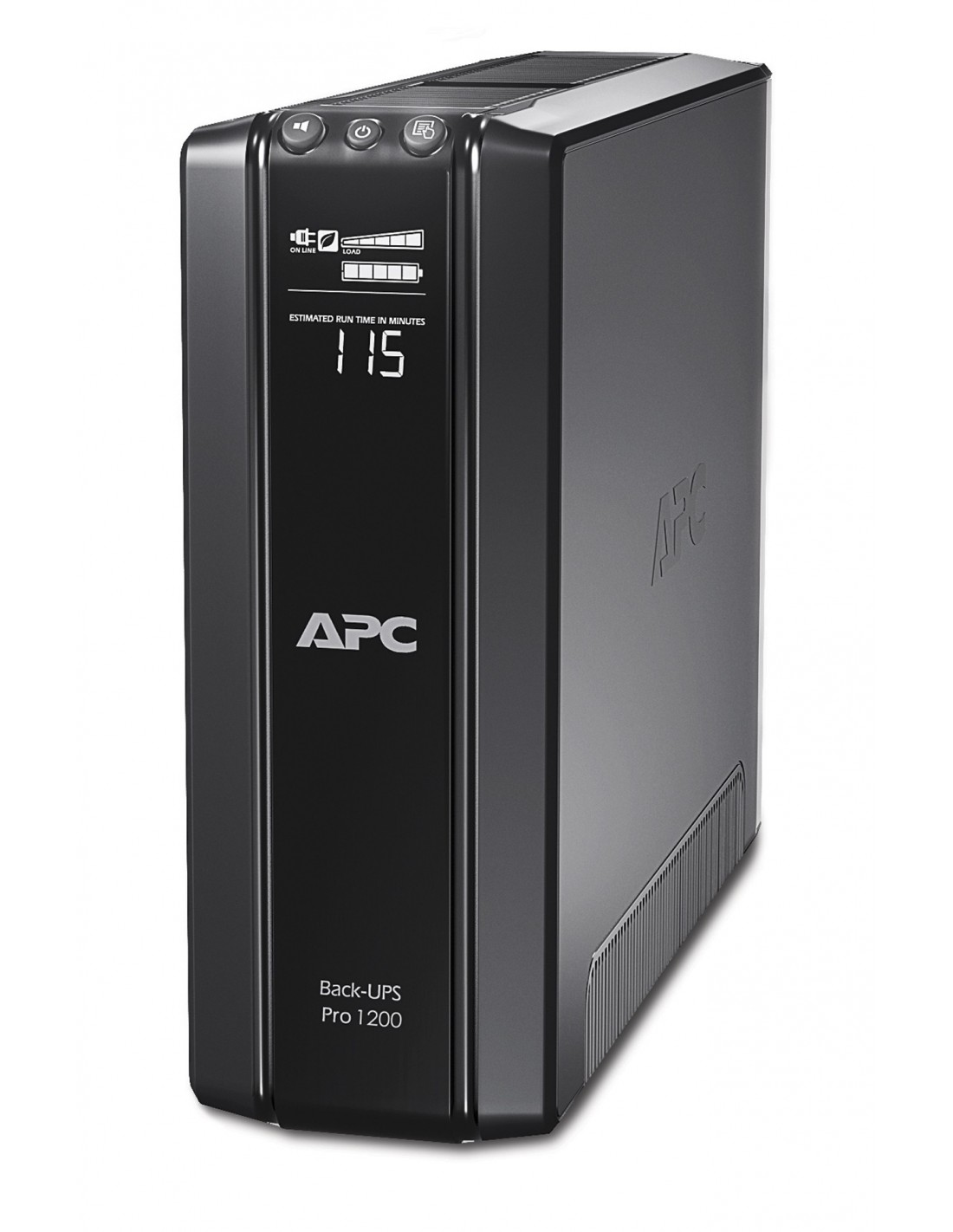 APC Back-UPS Pro. Topología UPS: Línea interactiva, Capacidad de potencia de salida (VA): 1,2 kVA, Potencia de salida: 720 W. Tipo de salida AC: Tipo F. Tecnología de batería: Sealed Lead Acid (VRLA), Capacidad de la batería: 187 VAh, Tiempo típico de respaldo a carga completa: 5,4 min. Color del producto: Negro, Longitud de cable: 1,83 m, Tipo de visualizador: LCD. Ancho: 112 mm, Profundidad: 382 mm, Altura: 301 mm