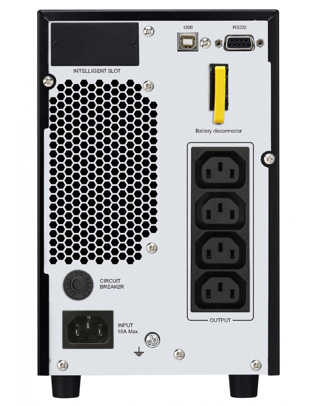APC SRV2KI. Topología UPS: Doble conversión (en línea), Capacidad de potencia de salida (VA): 2 kVA, Potencia de salida: 1600 W. Tipo de salida AC: C13 acoplador, Cantidad de salidas AC: 4 salidas AC, Tipo de puerto USB: USB Tipo B. Tecnología de batería: Sealed Lead Acid (VRLA), Tiempo de recarga de la batería: 4 h. Factor de forma: Torre, Color del producto: Negro, Tipo de visualizador: LCD. Ancho: 145 mm, Profundidad: 400 mm, Altura: 238 mm