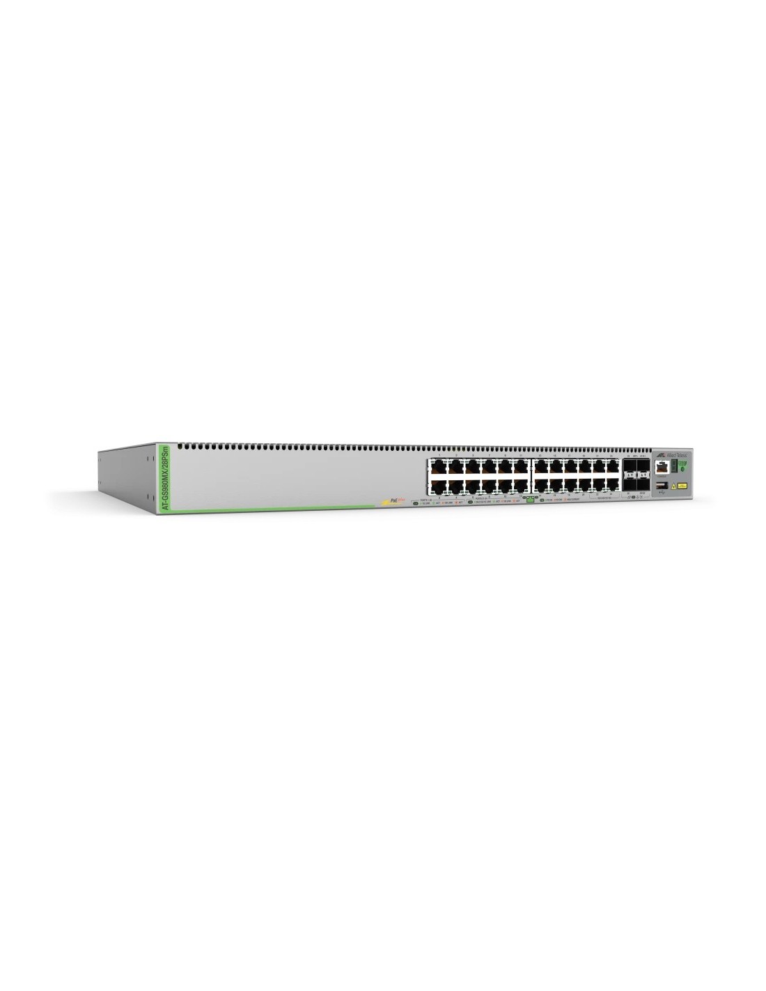 Allied Telesis AT-GS980MX/28PSM-50. Tipo de interruptor: Gestionado, Capa del interruptor: L3. Puertos tipo básico de conmutación RJ-45 Ethernet: Gigabit Ethernet (10/100/1000), Cantidad de puertos básicos de conmutación RJ-45 Ethernet: 20, Número de módulos SFP+ instalados: 4, Puerto de consola: USB. Tabla de direcciones MAC: 16000 entradas, Capacidad de conmutación: 160 Gbit/s. Estándares de red: IEEE 802.1AX, IEEE 802.1D, IEEE 802.1Q, IEEE 802.1p, IEEE 802.1s, IEEE 802.1v, IEEE 802.1w, IEEE.... Energía sobre Ethernet (PoE). Montaje en rack, Factor de forma: 1U