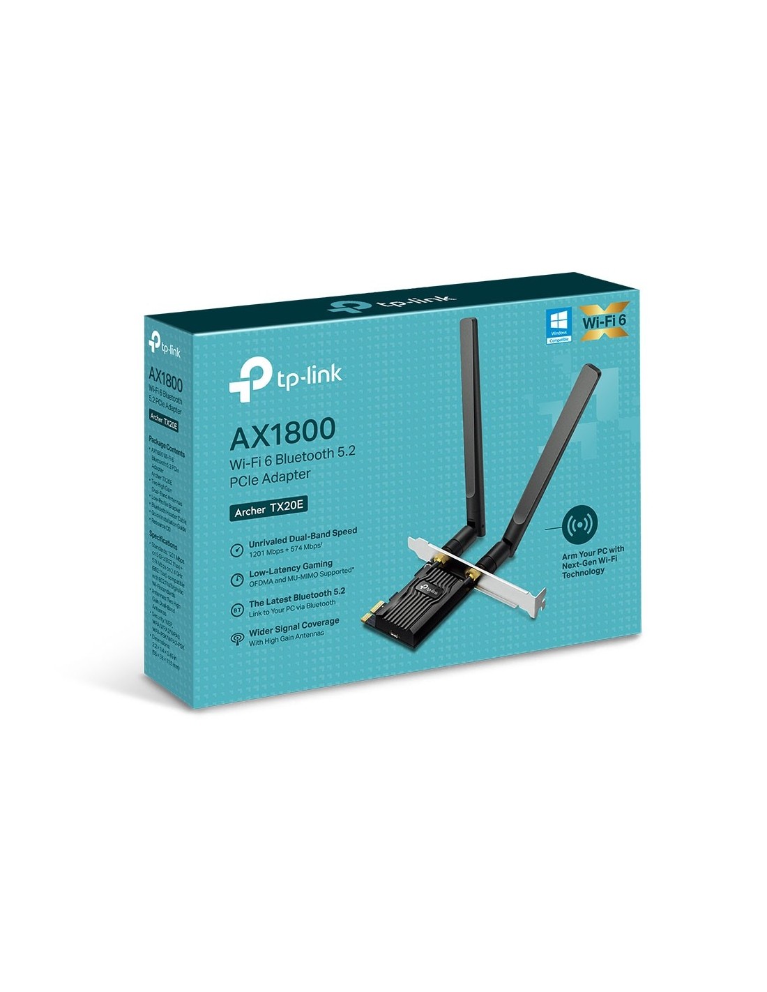 TP-Link Archer TX20E. Interno. Tecnología de conectividad: Inalámbrico, Interfaz de host: PCI Express, Interfaz: WLAN / Bluetooth. Rango máximo de transferencia de datos: 1800 Mbit/s, Estándar Wi-Fi: Wi-Fi 6 (802.11ax), Banda Wi-Fi: Doble banda (2,4 GHz / 5 GHz). Color del producto: Negro