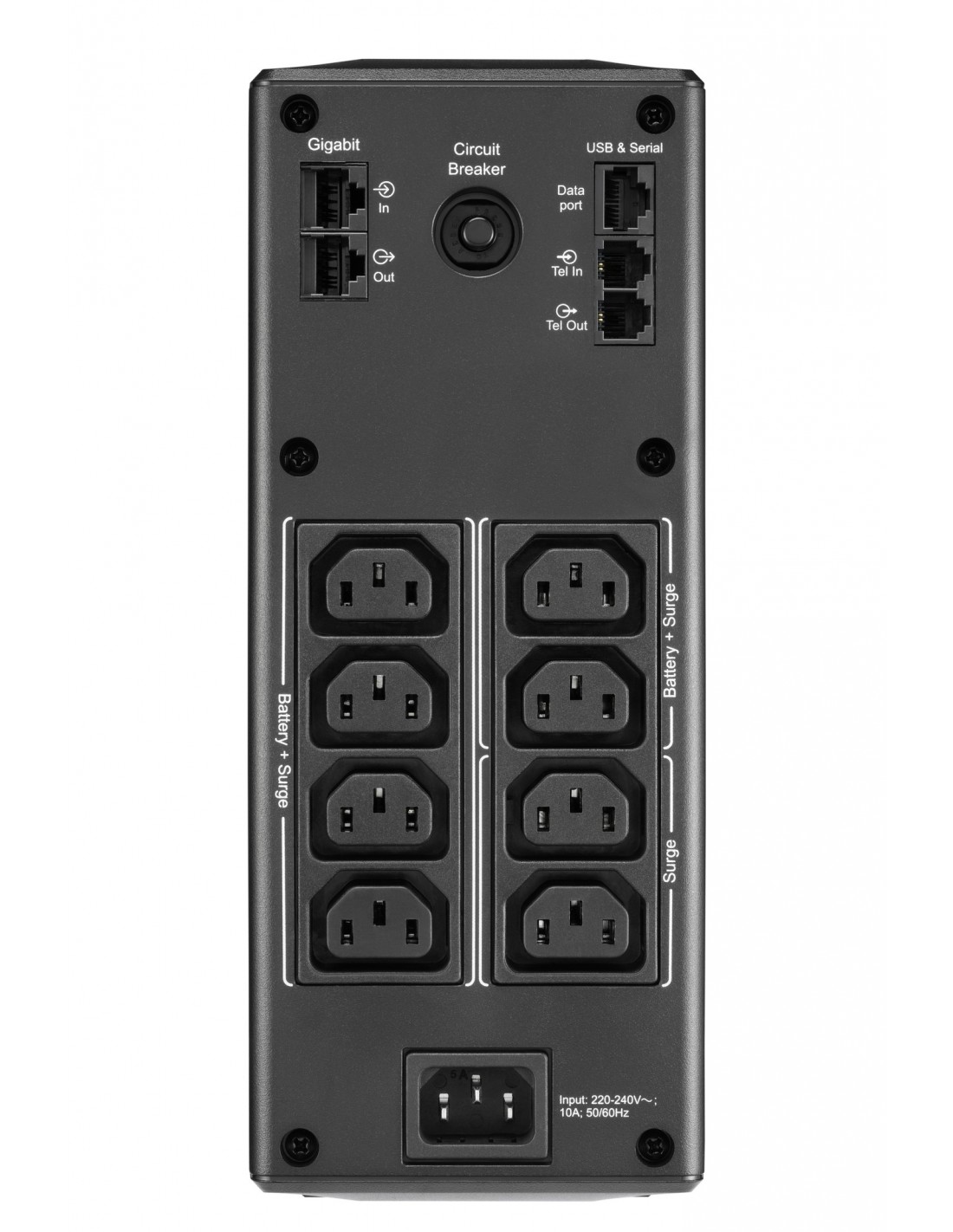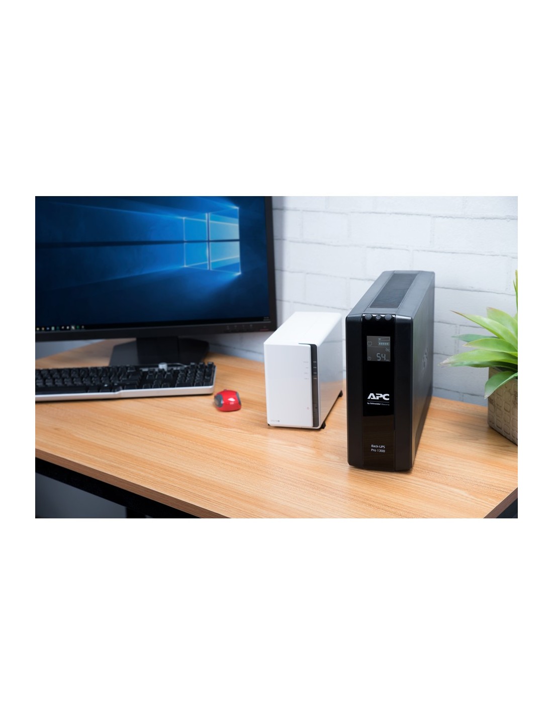 APC BR1300MI. Topología UPS: Línea interactiva, Capacidad de potencia de salida (VA): 1,3 kVA, Potencia de salida: 780 W. Tipo de salida AC: C13 acoplador, Conector: C14 acoplador, Cantidad de salidas AC: 8 salidas AC. Tecnología de batería: Sealed Lead Acid (VRLA), Vida útil de la batería (máx.): 5 año(s), Tiempo de recarga de la batería: 16 h. Factor de forma: Torre, Color del producto: Negro, Longitud de cable: 1,83 m. Ancho: 250 mm, Profundidad: 382 mm, Altura: 100 mm