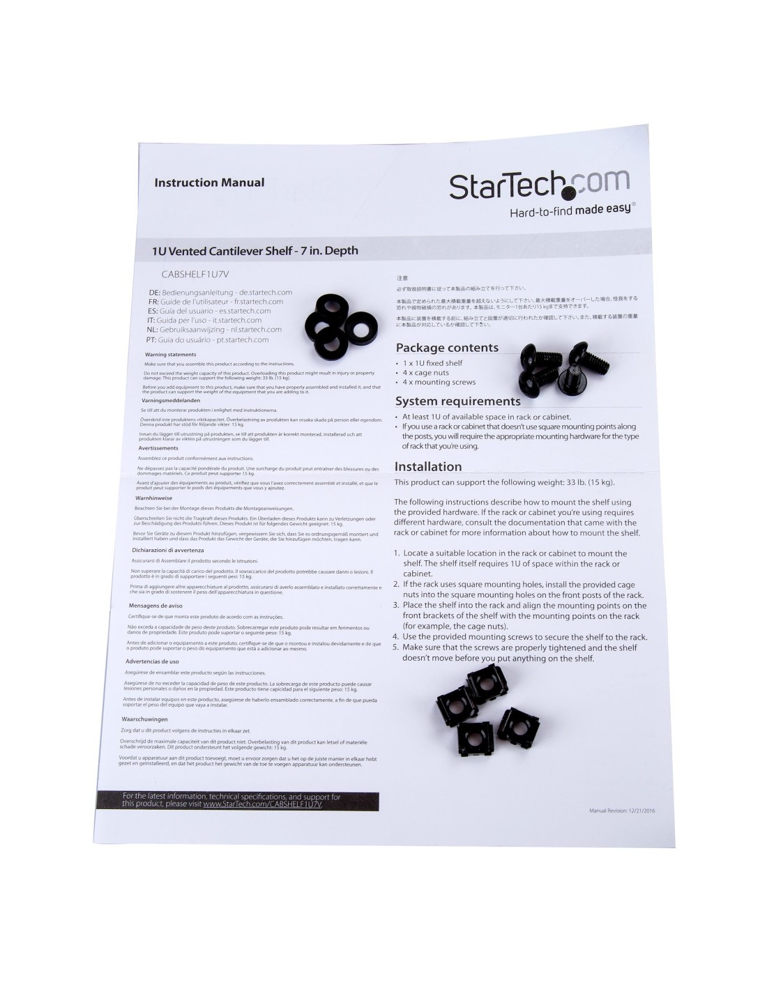 STARTECHStarTech.com Bandeja Estante Ventilado de 1U para Armario Rack de Servidores - de 7 Pulgadas de Profundidad, Cajón metálico para rack, Negro, Acero, 20 kg, 1U, EIA/ECA-310-E