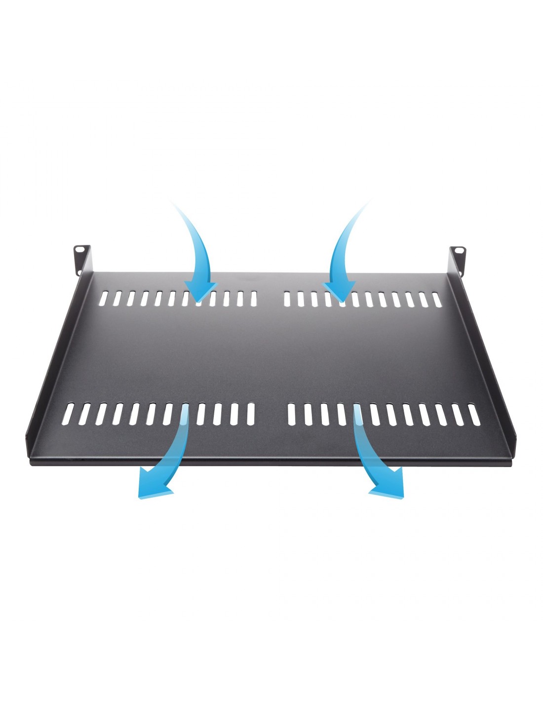 Esta bandeja 1U de armario para racks le permite agregar 40cm de espacio plano de almacenamiento en cualquier rack o armario compatible con EIA-310. El estante tiene aberturas de ventilación para permitir la circulación de aire y disipar las temperaturas de su rack.