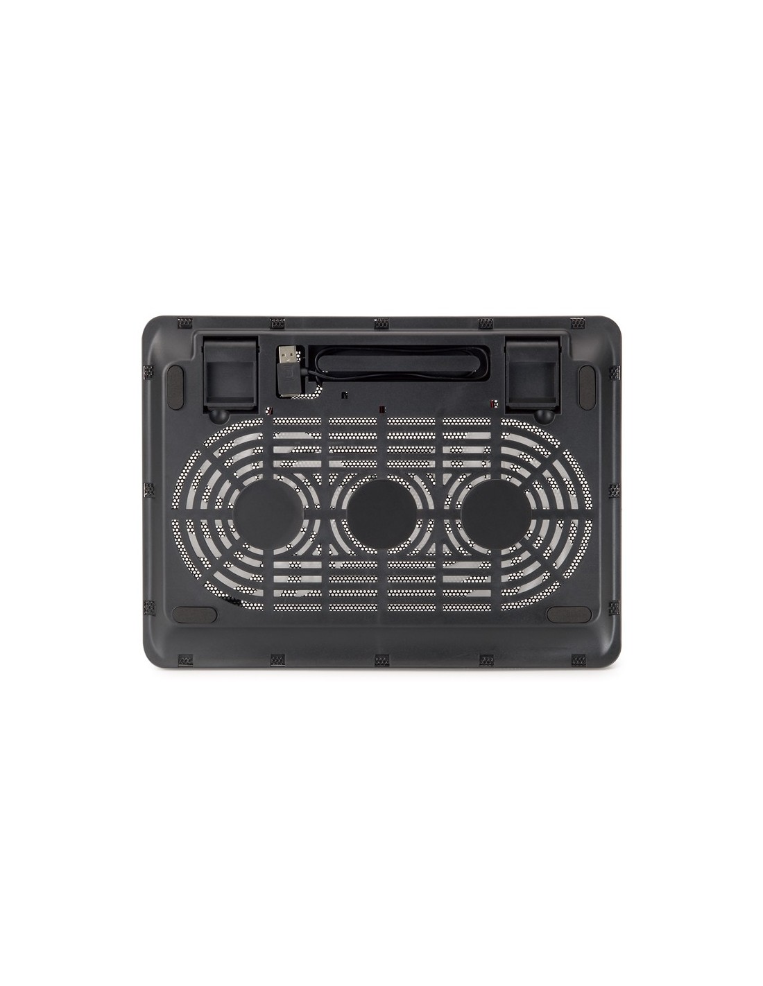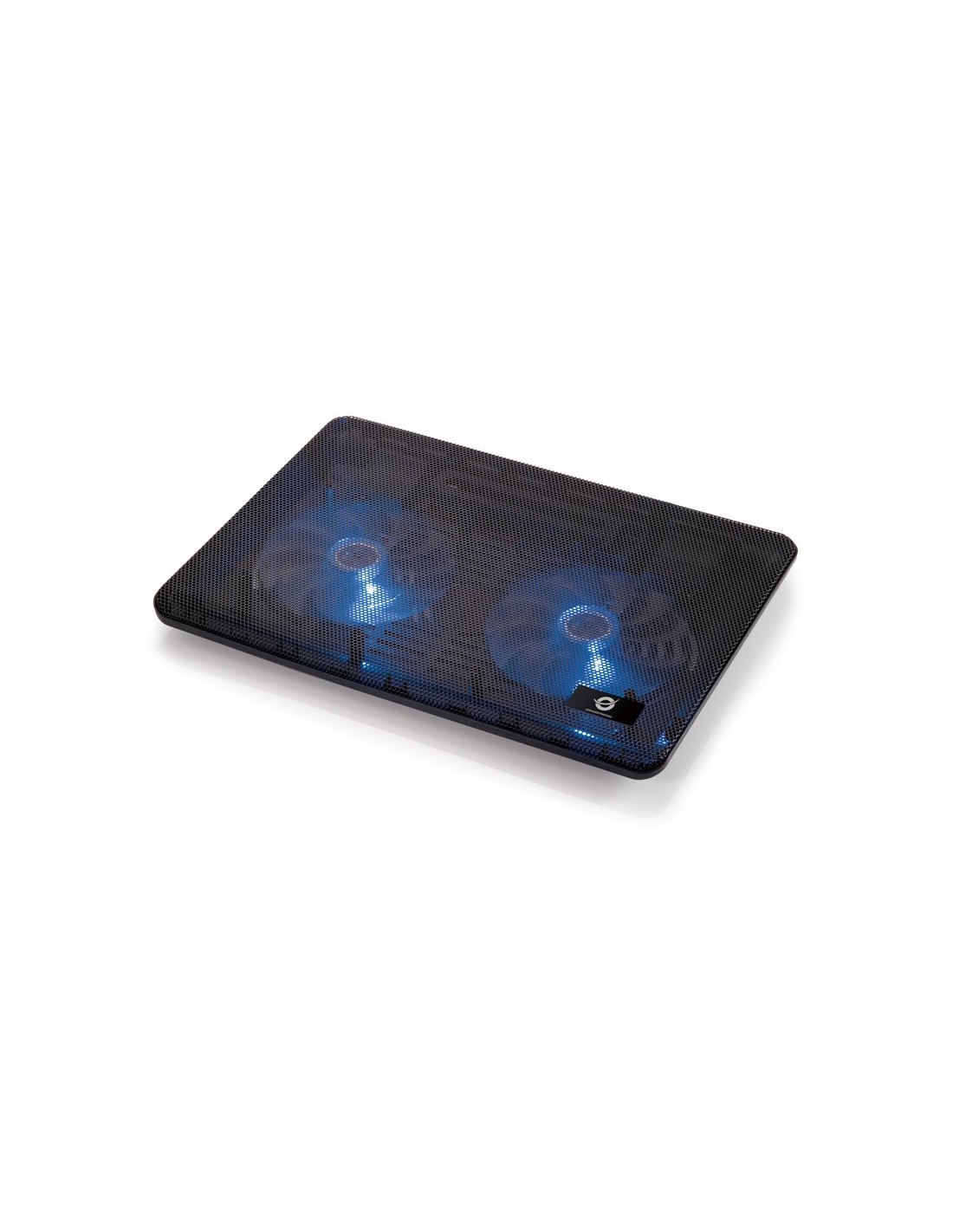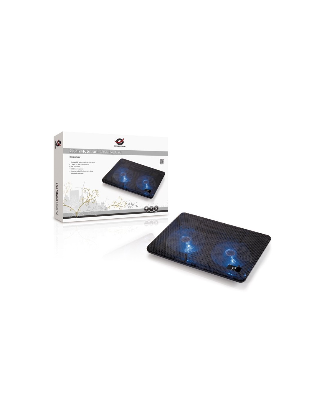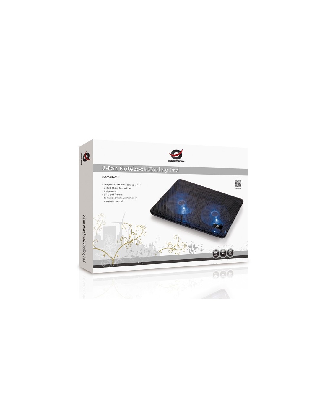 Conceptronic CNBCOOLPAD2F. Tamaño máximo de pantalla: 39,6 cm (15.6"), Número de ventiladores incluidos: 2 pieza(s), Diámetro de ventilador: 12,5 cm. Color del producto: Negro, Material: Aluminio. Interfaz de host: USB. Alimentación: USB. Ancho: 250 mm, Profundidad: 340 mm, Altura: 24 mm