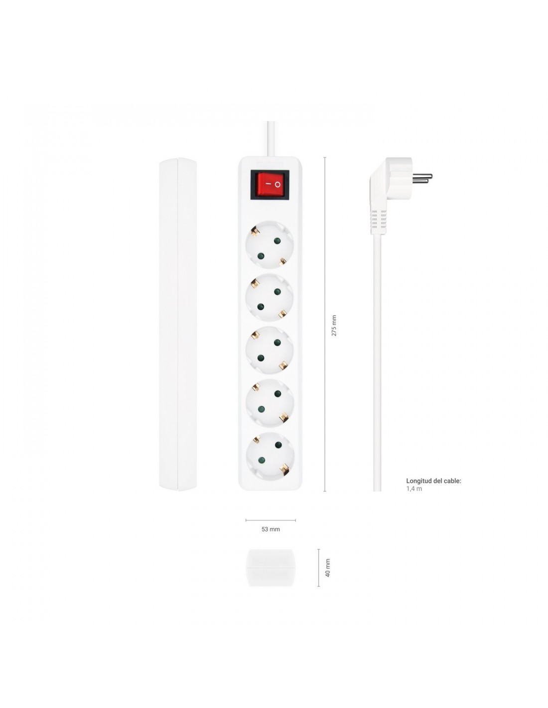 AISENS Base Multiple 5 Tomas con Interruptor con Cable 3×1.5mm2, Blanco, 1.4 m. Longitud de cable: 1,4 m, Colocación soportada: Interior, Tipo de salida AC: Tipo F. Cantidad de salidas AC: 5 salidas AC. Voltaje de entrada AC: 250 V, Potencia máx. de entrada: 3500 W, Máxima corriente: 16 A. Ancho: 53 mm, Profundidad: 275 mm, Altura: 40 mm. Número de productos incluidos: 1 pieza(s), Ancho del paquete: 100 mm, Profundidad del paquete: 275 mm