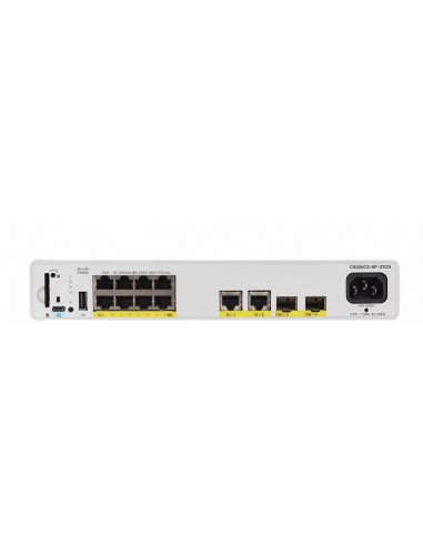Cisco Catalyst C9200CX-8P-2X2G-E. Tipo de interruptor: Gestionado, Capa del interruptor: L2/L3. Puertos tipo básico de conmutación RJ-45 Ethernet: Gigabit Ethernet (10/100/1000), Cantidad de puertos básicos de conmutación RJ-45 Ethernet: 8, Número de módulos SFP+ instalados: 2, Cantidad de puertos USB 2.0: 1. Bidireccional completo (Full duplex). Tabla de direcciones MAC: 32000 entradas, Capacidad de conmutación: 60 Gbit/s. Estándares de red: IEEE 802.1D, IEEE 802.1Q, IEEE 802.1p, IEEE 802.1s, IEEE 802.1w, IEEE 802.1x, IEEE 802.3, IEEE.... Energía sobre Ethernet (PoE). Montaje en rack