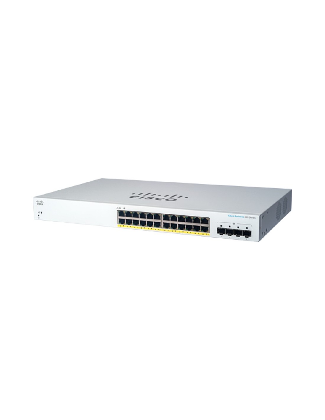 Cisco CBS220-24P-4G. Tipo de interruptor: Gestionado, Capa del interruptor: L2. Puertos tipo básico de conmutación RJ-45 Ethernet: Gigabit Ethernet (10/100/1000), Cantidad de puertos básicos de conmutación RJ-45 Ethernet: 24. Tabla de direcciones MAC: 8192 entradas, Capacidad de conmutación: 56 Gbit/s. Estándares de red: IEEE 802.1D, IEEE 802.1Q, IEEE 802.1p, IEEE 802.1s, IEEE 802.1w, IEEE 802.1x, IEEE 802.3, IEEE.... Energía sobre Ethernet (PoE). Montaje en rack, Factor de forma: 1U