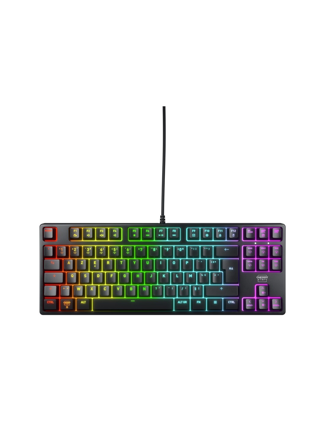 CHERRY K4V2 TKL. Formato del teclado: Tenkeyless (sin zona numérica) (80 - 87%). Estilo de teclado: Derecho. Tecnología de conectividad: Alámbrico, Interfaz del dispositivo: USB, Interruptor del teclado: Interruptor mecánico, Diseño de teclado: AZERTY, Teclado, cantidad de teclas: 68. Tipo de retroiluminación: LED RGB. Longitud de cable: 2 m. Uso recomendado: Juego. Color del producto: Negro