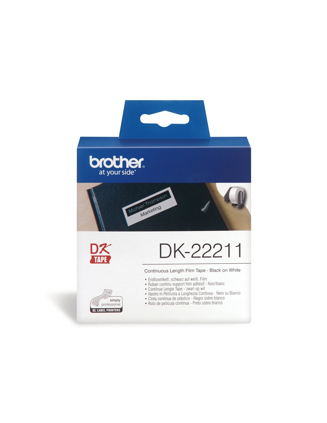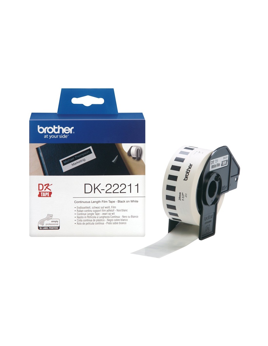 Brother Cinta continua de película plástica (blanca). Color de etiqueta: Negro sobre blanco, Etiquetas por rollo: 1 pieza(s), Tipo de cinta: DK. Ancho de cinta: 2,9 cm, Longitud de cinta: 15,24 m, Tipo de embalaje: Caja