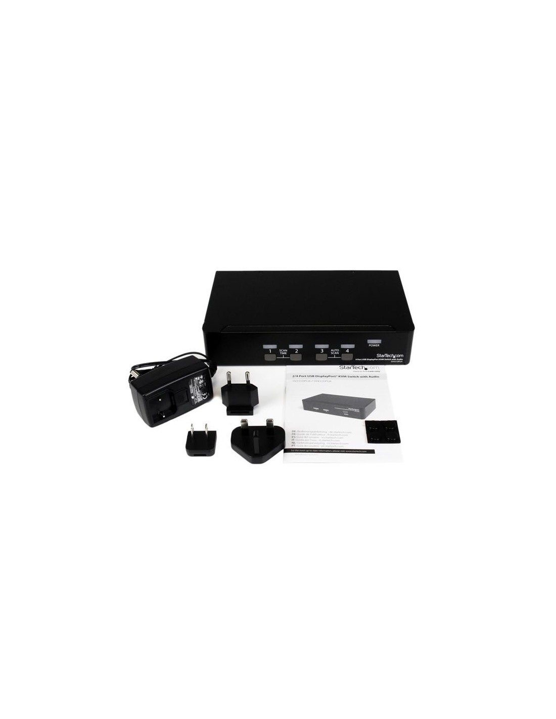 StarTech.com Conmutador Switch KVM 4 puertos Vídeo DisplayPort DP Hub Concentrador USB 2.0 Audio - 2560x1600. Tipo de puerto de teclado: USB, Tipo de puerto de ratón: USB, Tipo de puerto de vídeo: DisplayPort. Máxima resolución: 3840 x 2400 Pixeles, Resolución (máxima digital): 2560 x 1600 Pixeles, Número de usuarios: 1 usuario(s). Color del producto: Negro, Material de la carcasa: Acero, Tiempo medio entre fallos: 136000 h. Voltaje de entrada: 100 - 240 V, Corriente de entrada: 0.8 A, Voltaje de salida: 12 V. Certificados de conformidad: RoHS