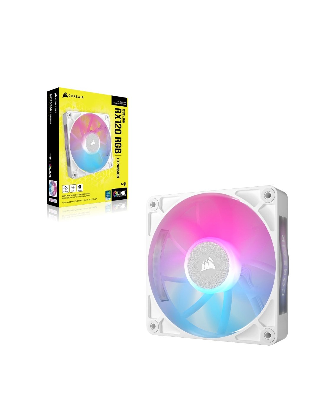 Corsair iCUE LINK RX120 RGB. Tipo: Ventilador, Diámetro de ventilador: 12 cm, Velocidad de rotación (mín.): 400 RPM, Velocidad de rotación (máx.): 2100 RPM, Tipo de soporte: Rodamiento de levitación magnética. Color del producto: Blanco