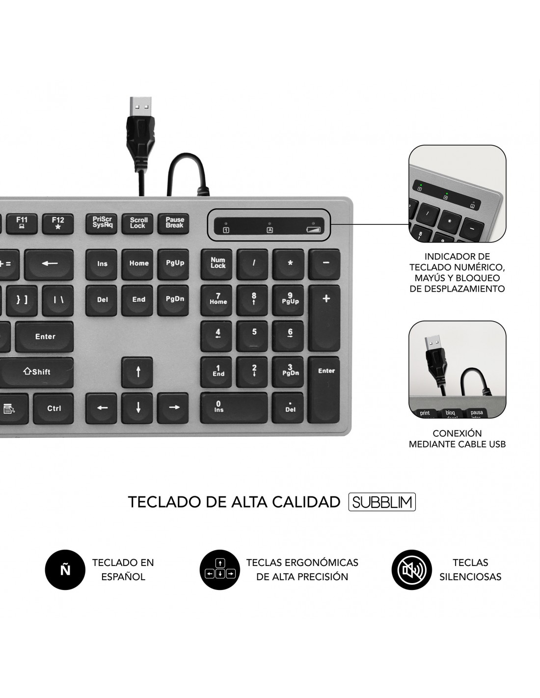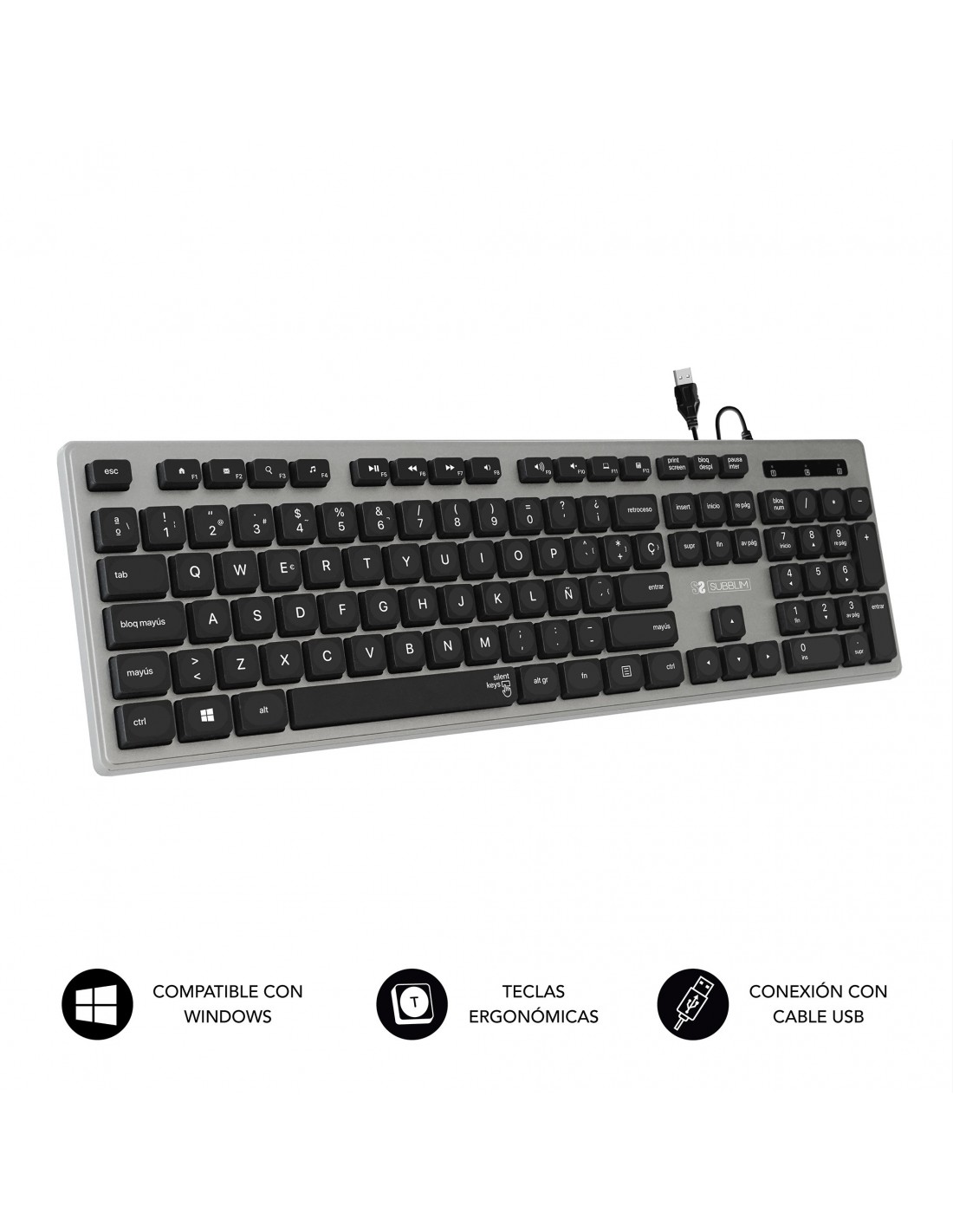 SUBBLIMSUBBLIM Teclado Ergonómico con cable USB Plano Silencioso Gris/Negro Ergo