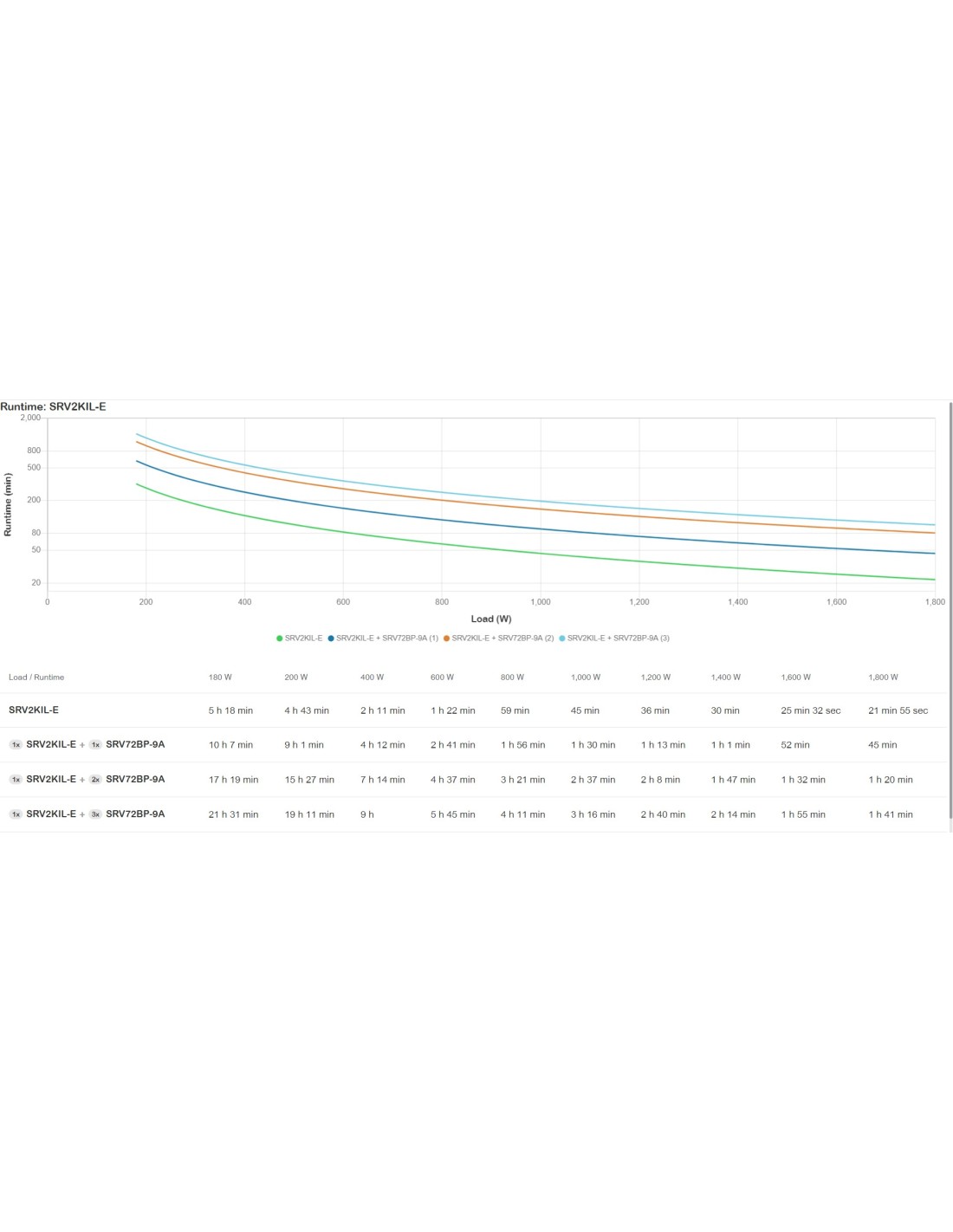 APC SRV2KIL-E. Capacidad de potencia de salida (VA): 2 kVA, Potencia de salida: 1800 W, Forma de onda: Seno. Conector: C20 acoplador. Tecnología de batería: Sealed Lead Acid (VRLA), Voltaje de la pila: 72 V, Tiempo de recarga de la batería: 5,5 h. Color del producto: Negro, Código IP (International Protection): IP20. Ancho: 335 mm, Profundidad: 425 mm, Altura: 336 mm