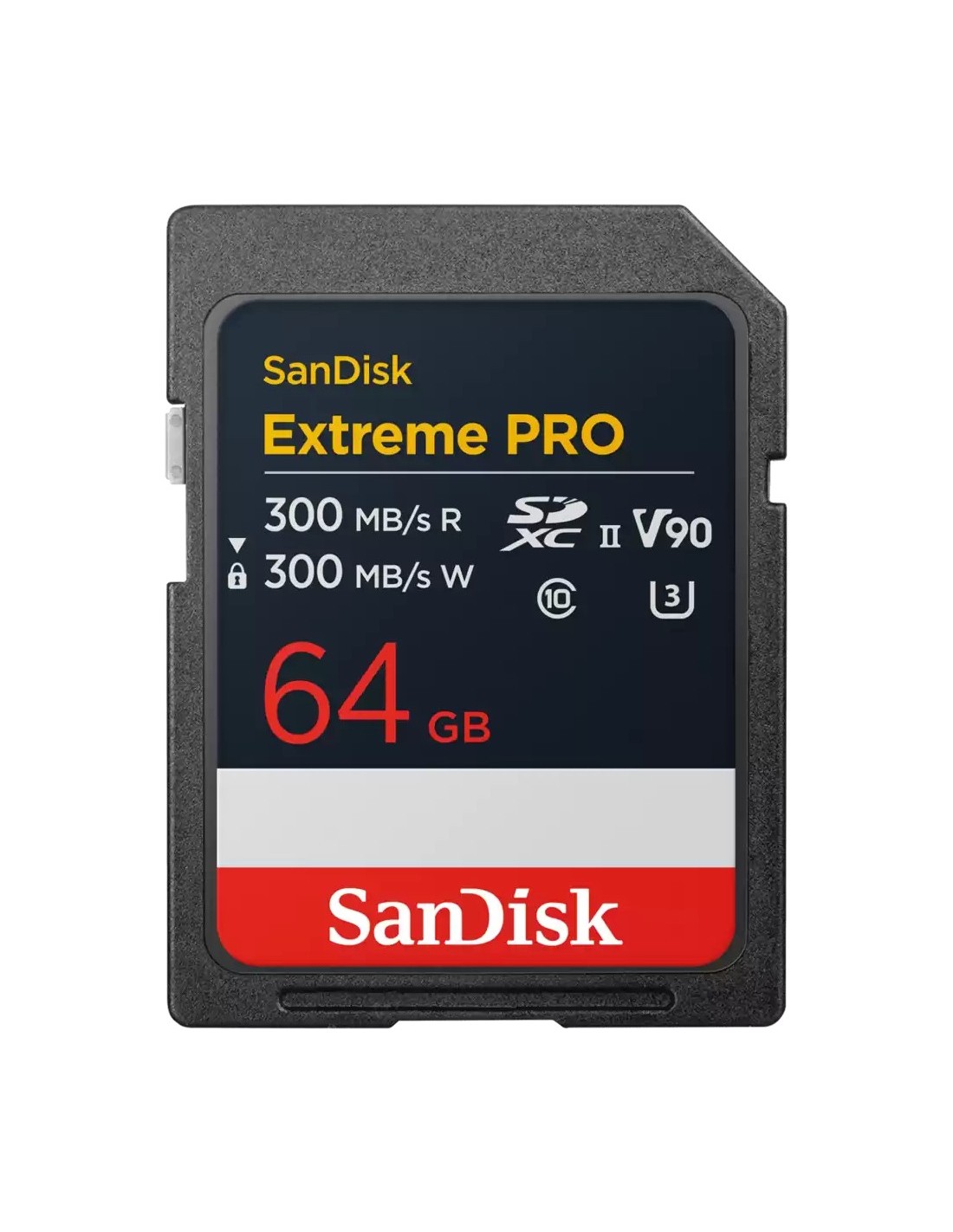 SanDisk Extreme PRO. Capacidad: 64 GB, Tipo de tarjeta flash: SDXC, Clase de memoria flash: Clase 10, Tipo de memoria interna: UHS-II, Velocidad de lectura: 300 MB/s, Velocidad de escritura: 300 MB/s, Clase de velocidad UHS: Class 3 (U3), Clase de velocidad de vídeo: V90. Funciones de protección: Protección contra caídas, Resistente al polvo, Resistente al agua, Color del producto: Negro