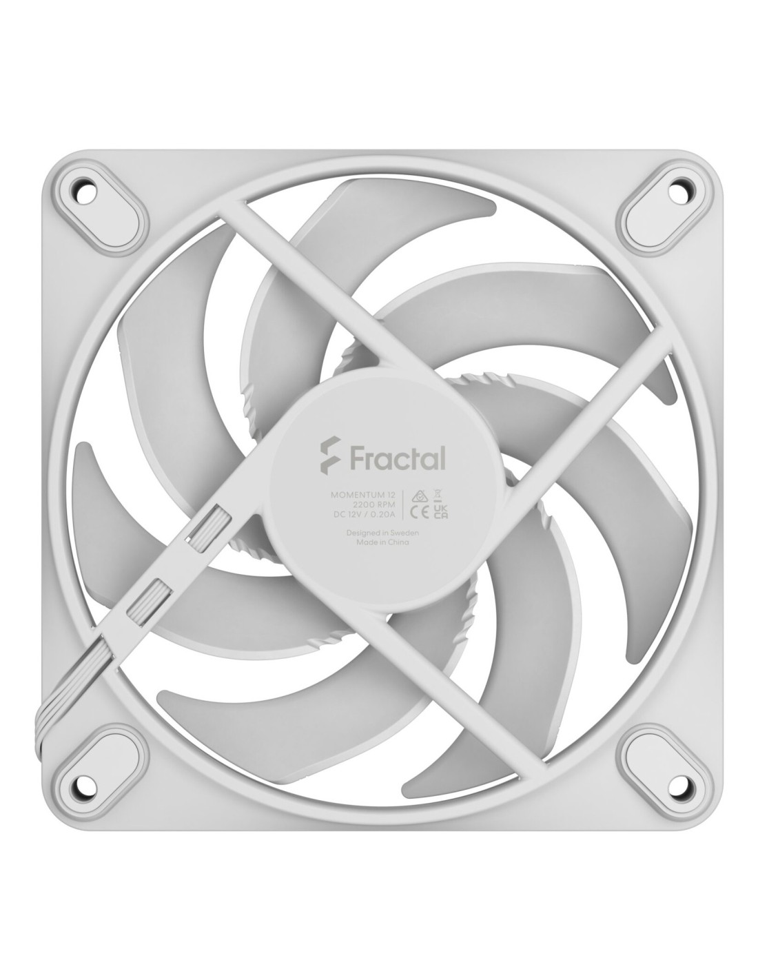Fractal Design Momentum 12. Tipo: Ventilador, Diámetro de ventilador: 12 cm, Velocidad de rotación (mín.): 350 RPM, Velocidad de rotación (máx.): 2200 RPM, flujo de aire: 114,6 m³/h, Presión máxima de aire: 2,51 mmH2O, Tipo de soporte: Rodamiento dinámico fluido (FDB). Color del producto: Blanco