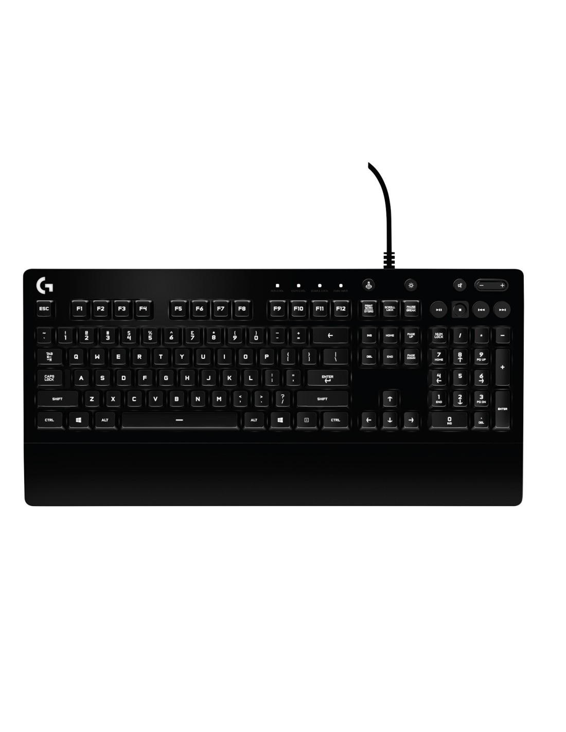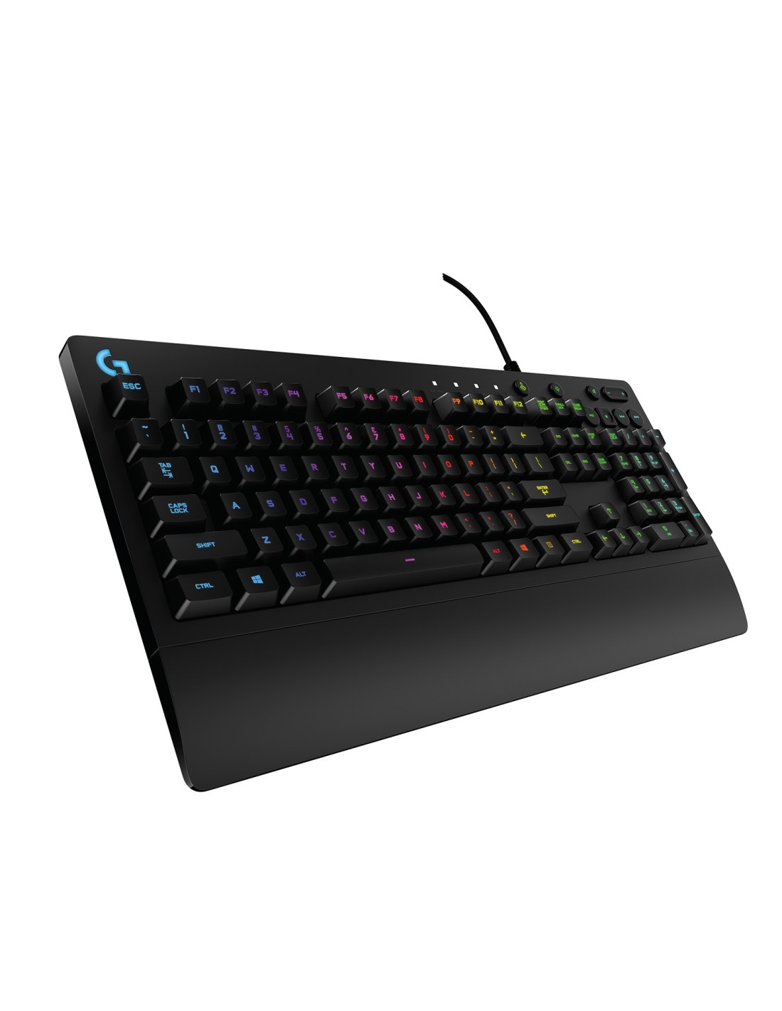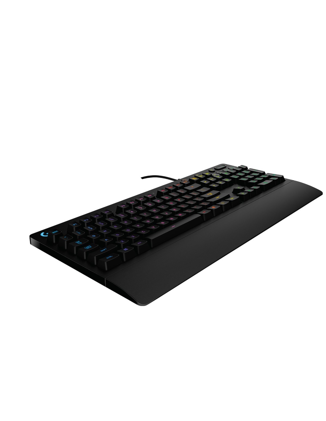 Logitech G G213 Prodigy. Formato del teclado: Completo (100%). Estilo de teclado: Derecho. Tecnología de conectividad: Alámbrico, Interfaz del dispositivo: USB, Interruptor del teclado: Interruptor mecánico, Diseño de teclado: AZERTY. Tipo de retroiluminación: LED RGB, Descansa muñecas. Longitud de cable: 1,8 m. Uso recomendado: Juego. Color del producto: Negro