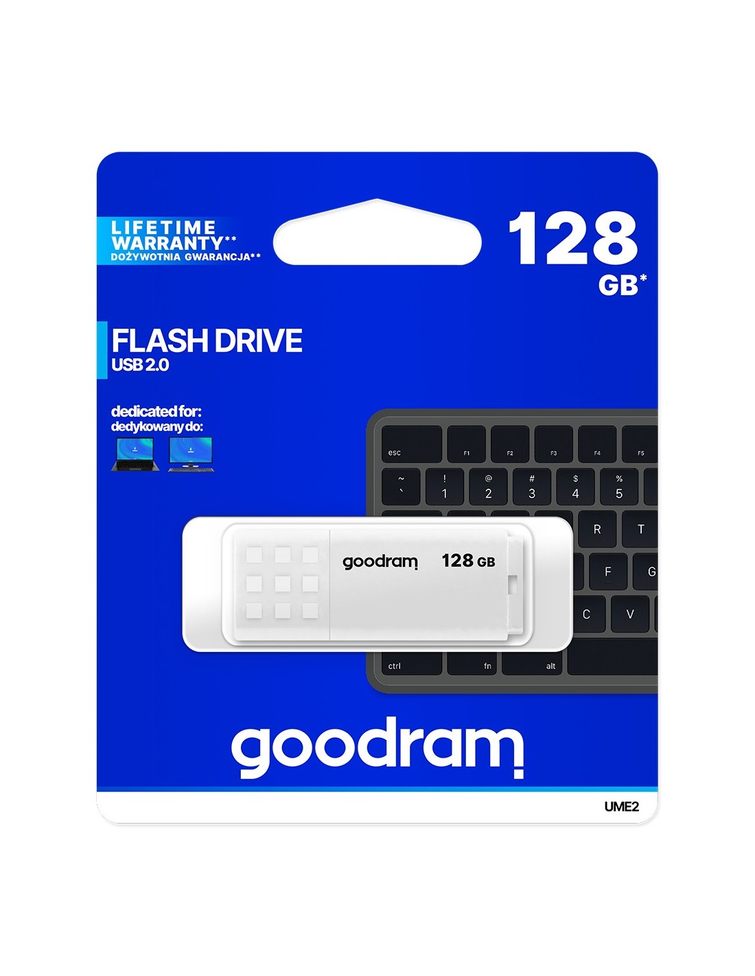 Goodram UME2. Capacidad: 128 GB, Interfaz del dispositivo: USB tipo A, Versión USB: 2.0, Velocidad de lectura: 20 MB/s, Velocidad de escritura: 5 MB/s. Factor de forma: Tapa. Peso: 9 g. Color del producto: Blanco