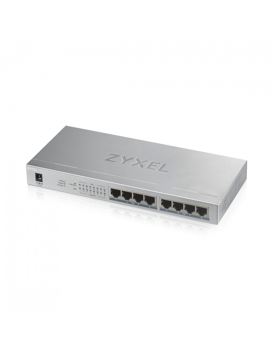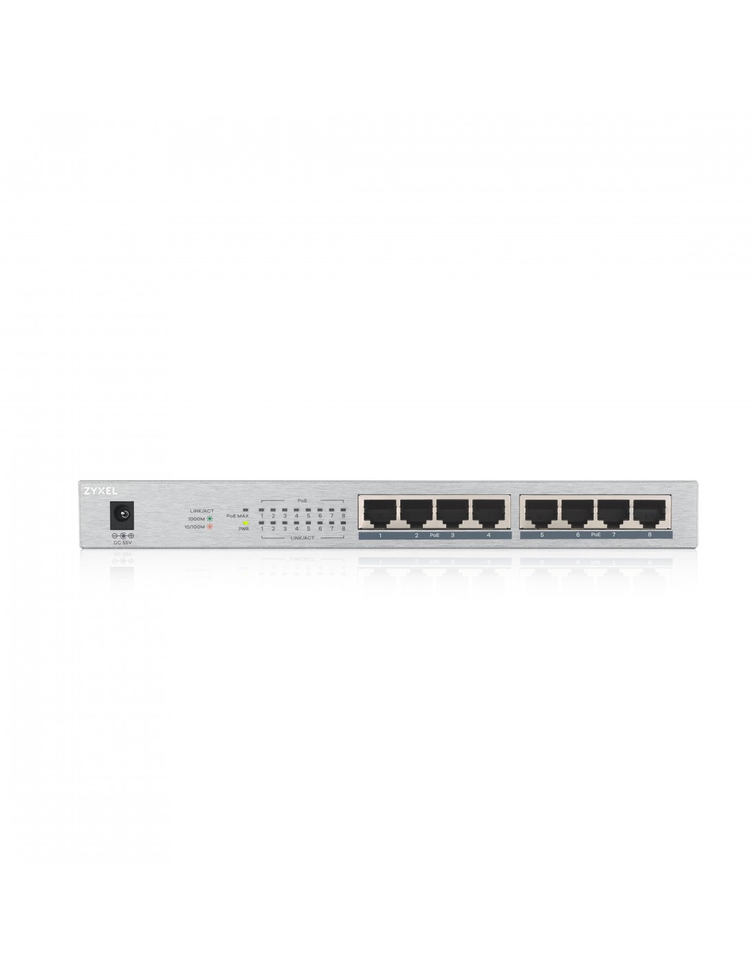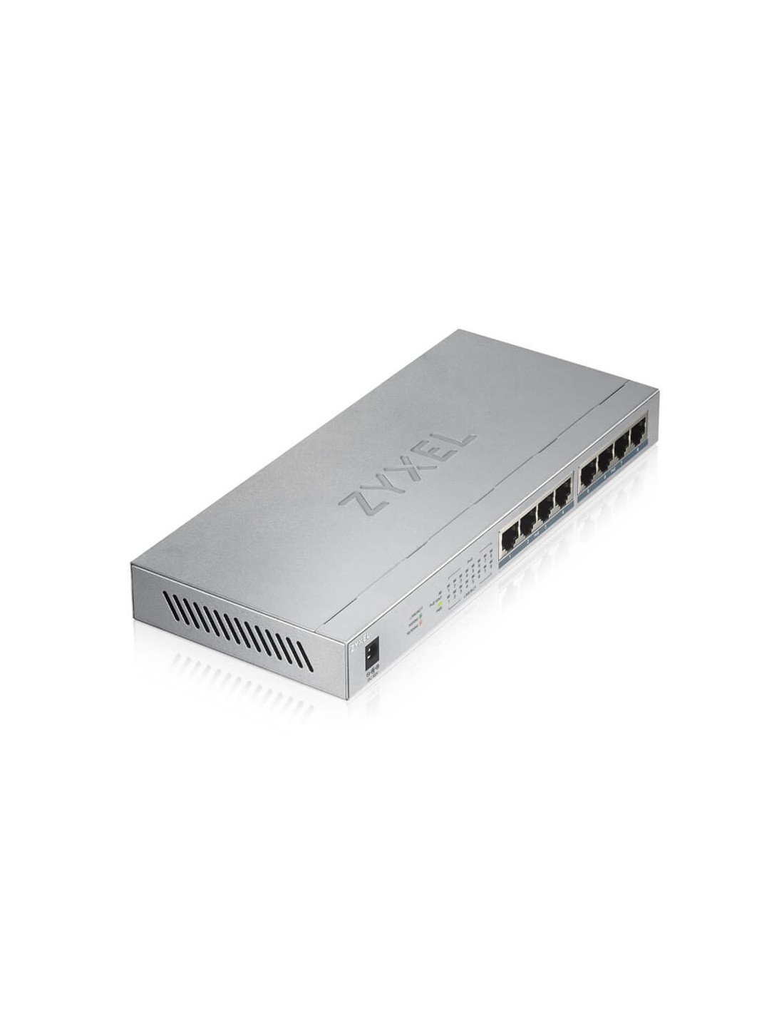 Zyxel GS1008HP. Tipo de interruptor: No administrado. Puertos tipo básico de conmutación RJ-45 Ethernet: Gigabit Ethernet (10/100/1000), Cantidad de puertos básicos de conmutación RJ-45 Ethernet: 8. Capacidad de conmutación: 16 Gbit/s. Estándares de red: IEEE 802.3, IEEE 802.3ab, IEEE 802.3u, IEEE 802.3x. Voltaje de entrada DC: 55 V. Conector eléctrico: Toma de entrada de CC. Energía sobre Ethernet (PoE)
