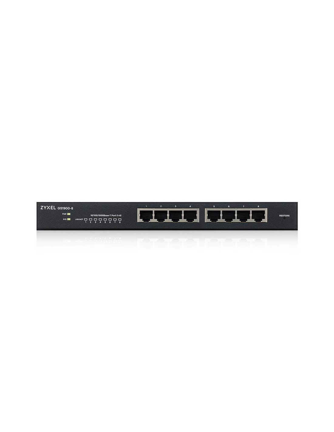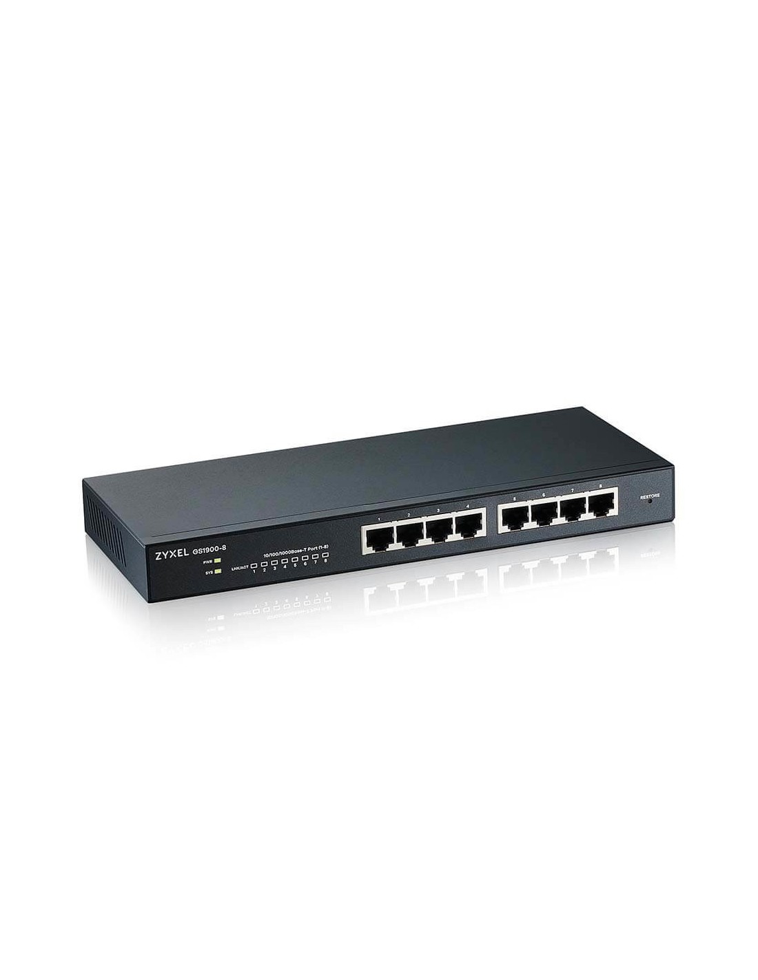 Zyxel GS1900-8. Tipo de interruptor: Gestionado, Capa del interruptor: L2. Puertos tipo básico de conmutación RJ-45 Ethernet: Gigabit Ethernet (10/100/1000), Cantidad de puertos básicos de conmutación RJ-45 Ethernet: 8. Bidireccional completo (Full duplex). Tabla de direcciones MAC: 8000 entradas, Capacidad de conmutación: 16 Gbit/s. Estándares de red: IEEE 802.1Q, IEEE 802.1p, IEEE 802.1x, IEEE 802.3, IEEE 802.3ab, IEEE 802.3ad, IEEE 802.3af, IEEE.... Conector eléctrico: Toma de entrada de CC. Montaje en rack