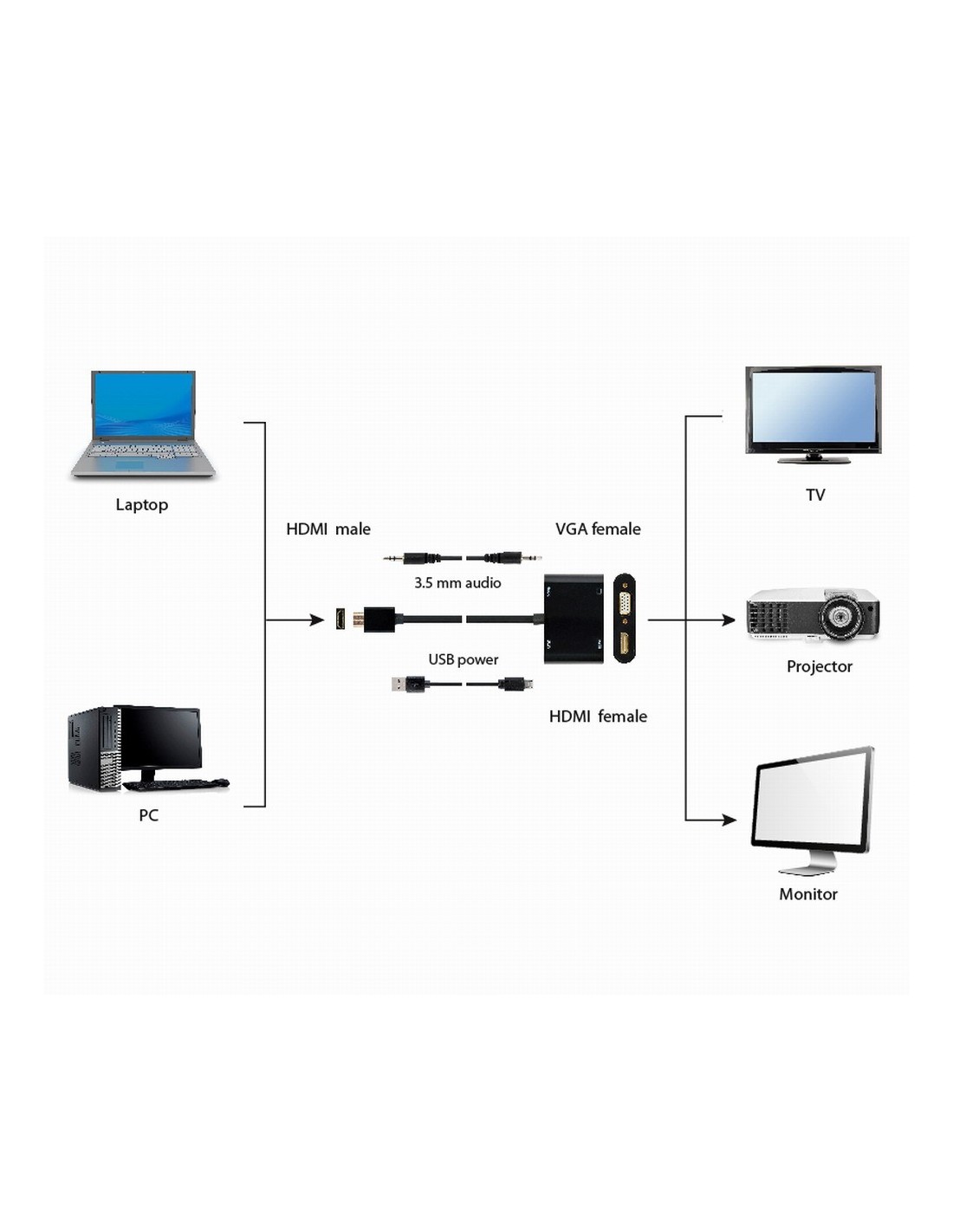 Cable adaptador HDMI macho a HDMI hembra + VGA Permite la conexión de un video HDMI y una pantalla VGA a una fuente de video HDMI Audio analógico: salida estéreo de 3,5 mm