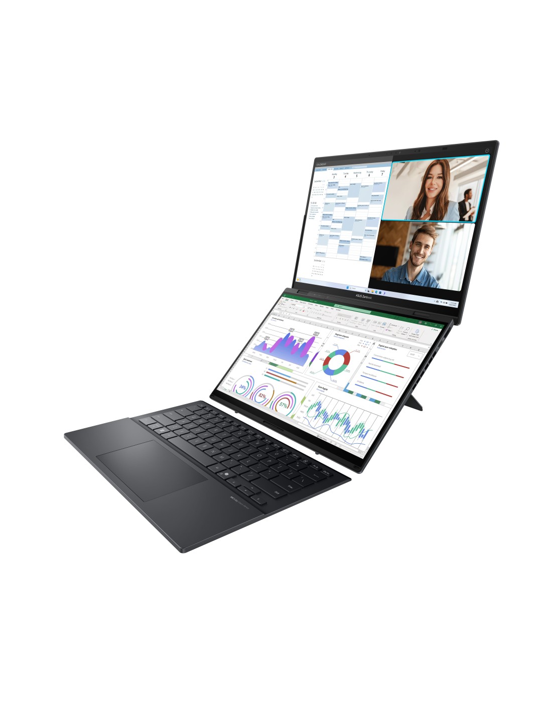 ASUS Zenbook Duo OLED UX8406CA-PZ009W - Ordenador Portátil 14" WQXGA+ 120Hz (Intel Core Ultra 9 285H, 32GB RAM, 2TB SSD, Arc 140T, Windows 11 Home) Gris Tintero - Teclado QWERTY español. Tipo de producto: Híbrido (2-en-1), Factor de forma: Convertible (extraíble). Familia de procesador: Intel Core Ultra 9, Modelo del procesador: 285H. Diagonal de la pantalla: 35,6 cm (14"), Tipo HD: WQXGA+, Resolución de la pantalla: 2880 x 1800 Pixeles, Pantalla táctil. Memoria interna: 32 GB, Tipo de memoria interna: LPDDR5x-SDRAM. Capacidad total de almacenaje: 2 TB, Unidad de almacenamiento: SSD. Modelo de adaptador gráfico incorporado: Intel Arc 140T. Sistema operativo instalado: Windows 11 Home. Color del producto: Gris