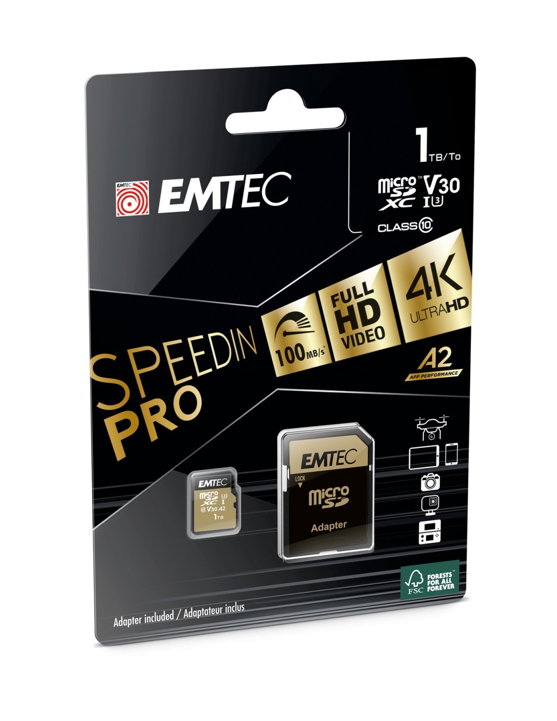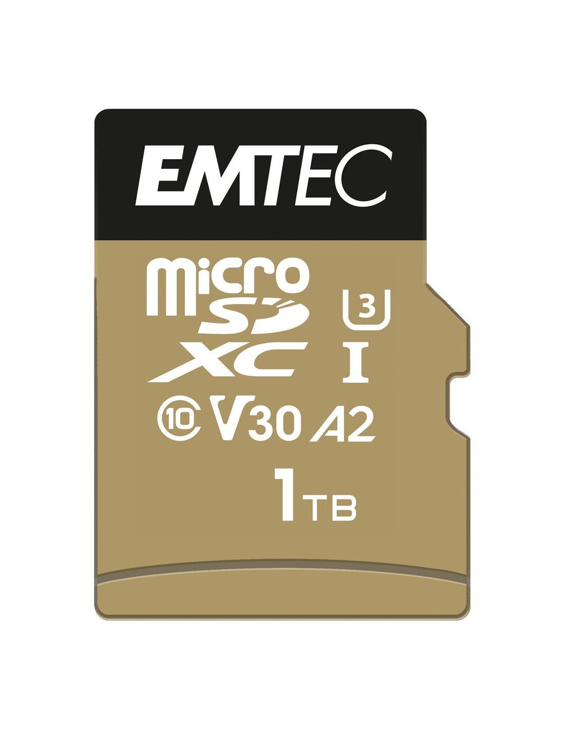 Emtec ECMSDM1TXC10SP. Capacidad: 1 TB, Tipo de tarjeta flash: MicroSDXC, Clase de memoria flash: Clase 10, Tipo de memoria interna: UHS-I, Velocidad de lectura: 100 MB/s, Velocidad de escritura: 100 MB/s, Clase de velocidad UHS: Class 3 (U3), Clase de velocidad de vídeo: V30. Color del producto: Marrón