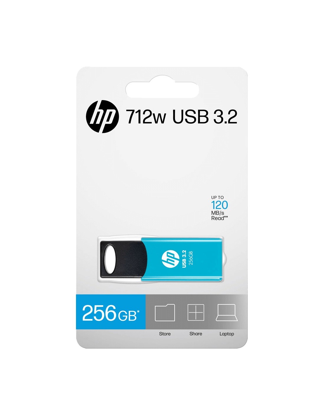 HP 712w. Capacidad: 256 GB, Interfaz del dispositivo: USB tipo A, Versión USB: 3.2 Gen 1 (3.1 Gen 1), Velocidad de lectura: 120 MB/s. Factor de forma: Deslizar. Peso: 10,2 g. Color del producto: Azul