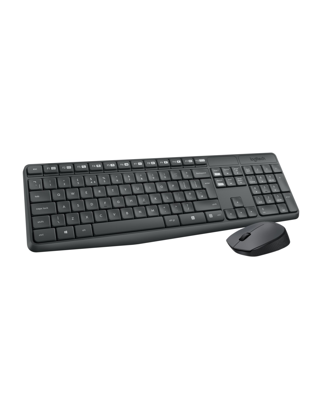 Logitech MK235. Formato del teclado: Completo (100%). Estilo de teclado: Derecho. Tecnología de conectividad: Inalámbrico, Interfaz del dispositivo: RF inalámbrico, Diseño de teclado: QWERTY, Teclado, cantidad de teclas: 100, Uso recomendado: Universal. Color del producto: Gris. Ratón incluido