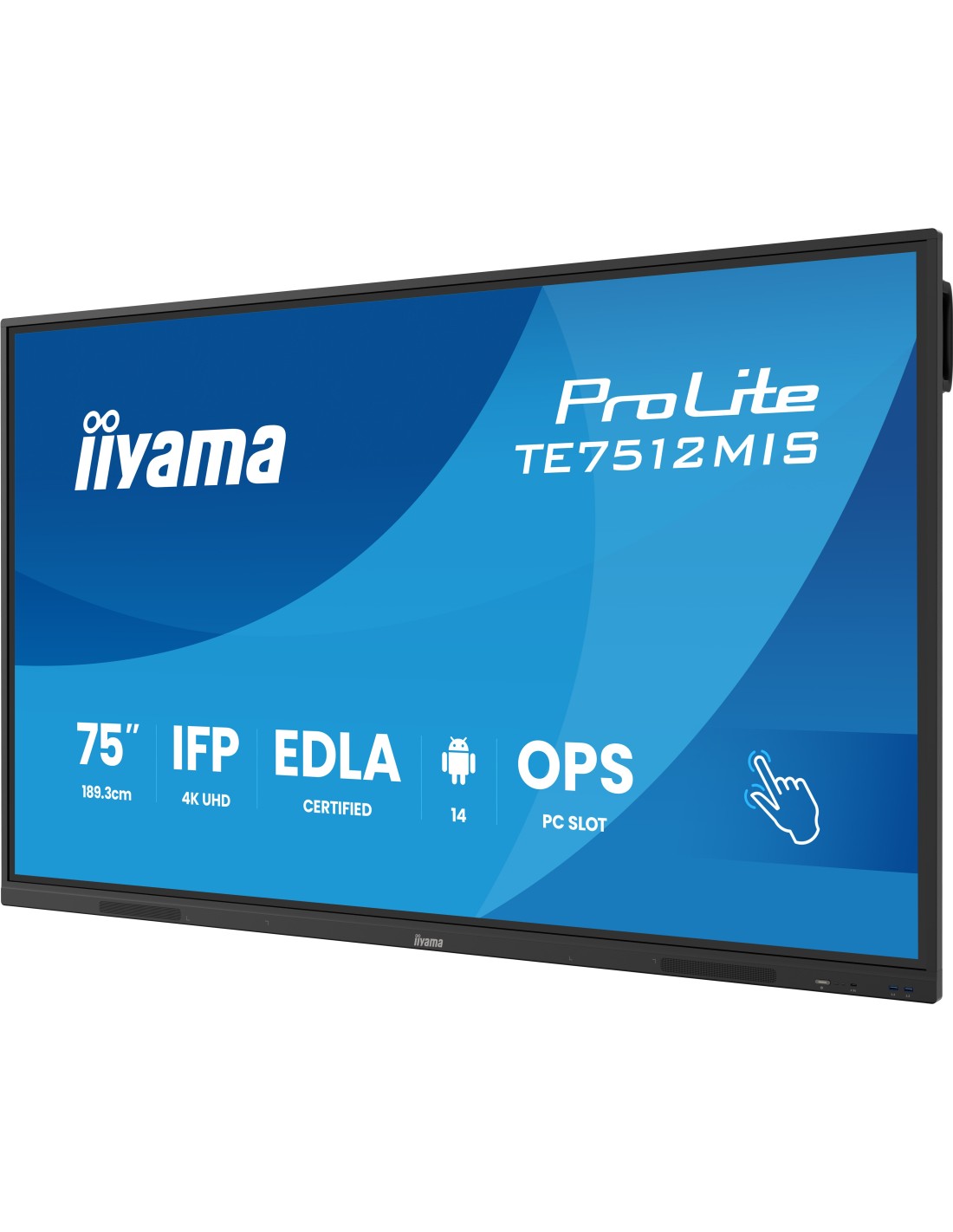 iiyama TE7512MIS-B4AG. Diseño de producto: Panel plano interactivo. Diagonal de la pantalla: 190,5 cm (75"), Tecnología de visualización: LCD, Resolución de la pantalla: 3840 x 2160 Pixeles, Brillo de pantalla: 400 cd / m², Tipo HD: 4K Ultra HD, Pantalla táctil. Wifi. Horas de funcionamiento (horas/días): 24/7. Sistema operativo instalado: Android. Color del producto: Negro