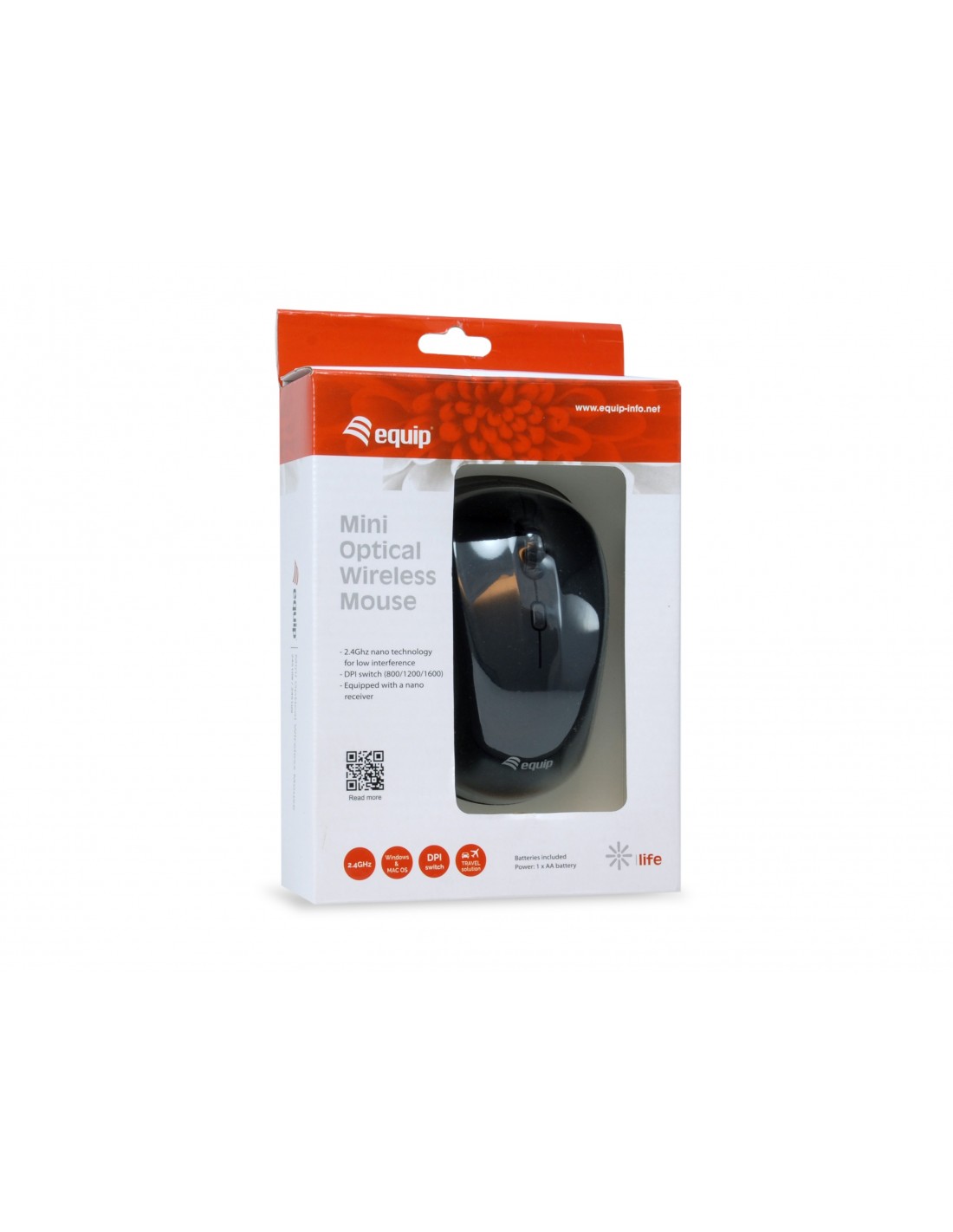 Equip 245108. Factor de forma: Ambidextro. Tecnología de detección de movimientos: Óptico, Interfaz del dispositivo: RF inalámbrico, Resolución de movimiento: 1600 DPI, Tipo de botones: Botones presionados, Cantidad de botones: 2, Tipo de desplazamiento: Rueda. Fuente de energía: Baterías. Color del producto: Negro