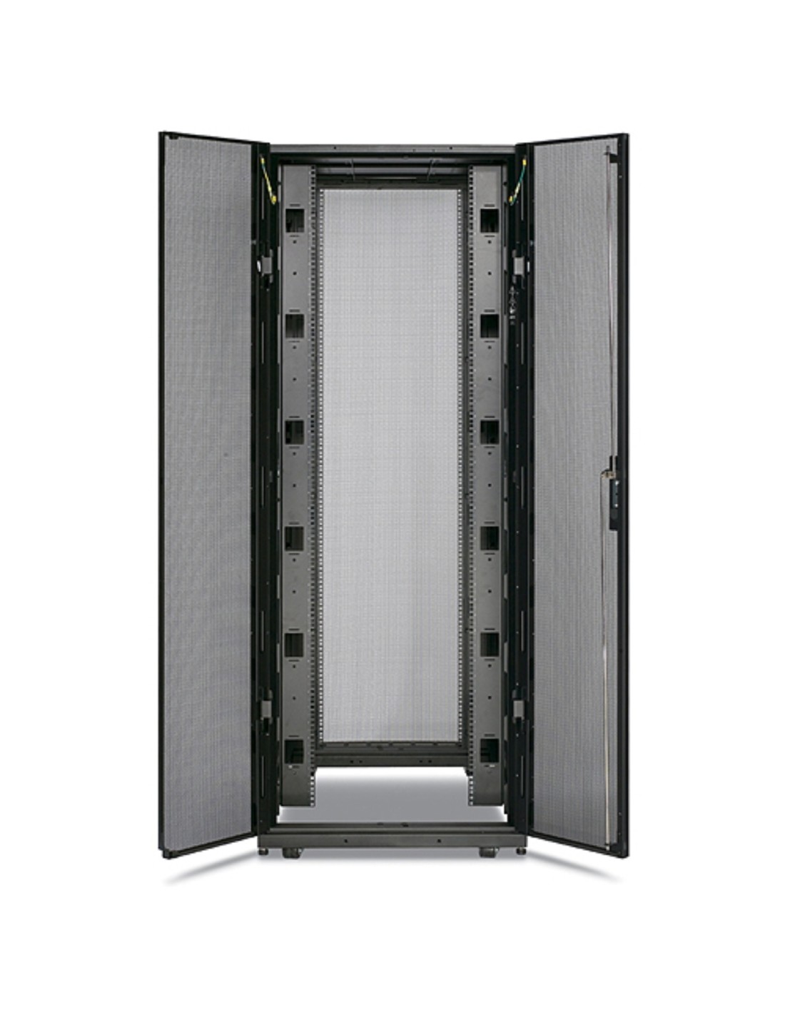 Armario ancho con opciones de gestión del cable mejoradas para servidores y aplicaciones de red de alta densidad. Altura de 42U para desenrollarlo fácilmente en las entradas.