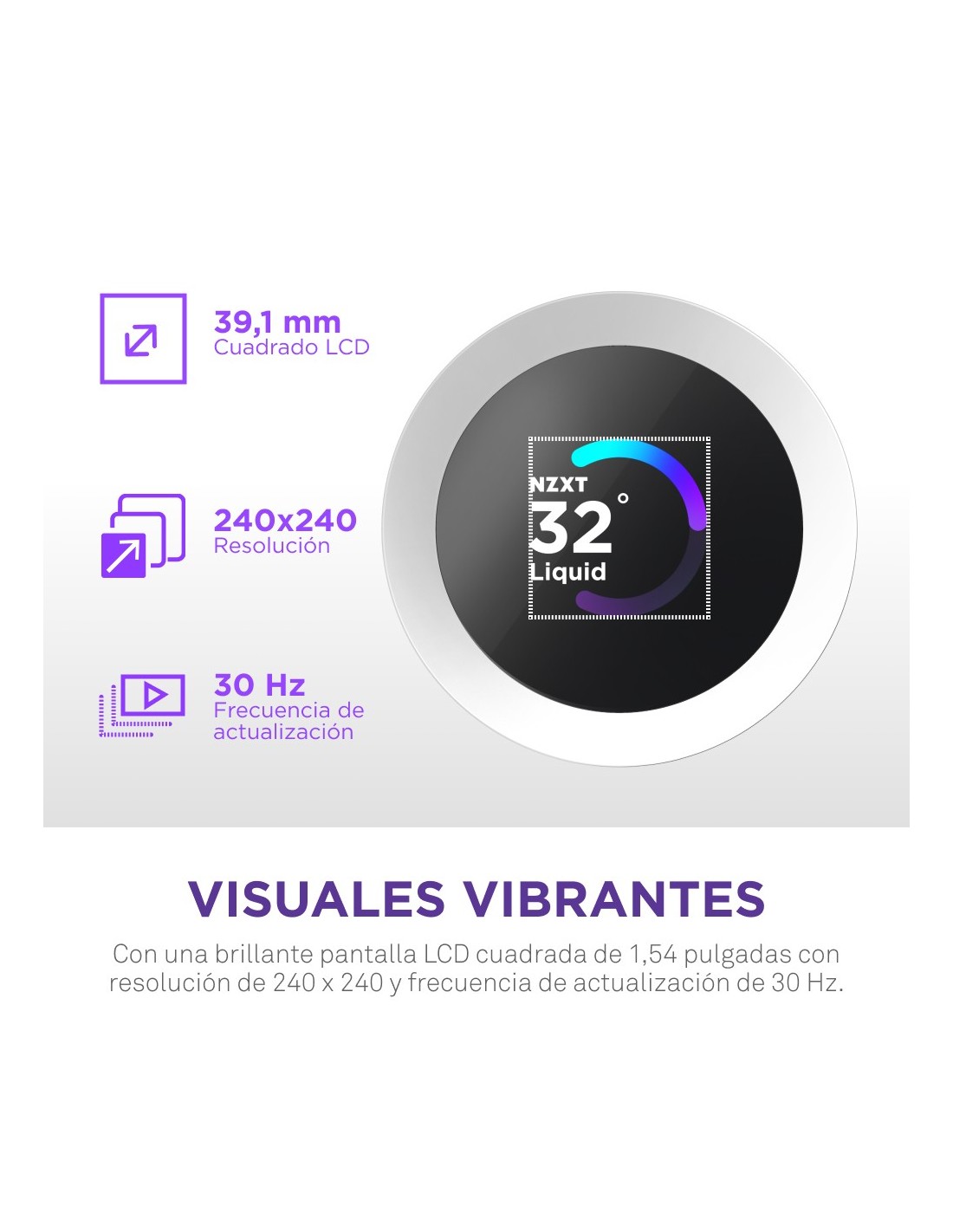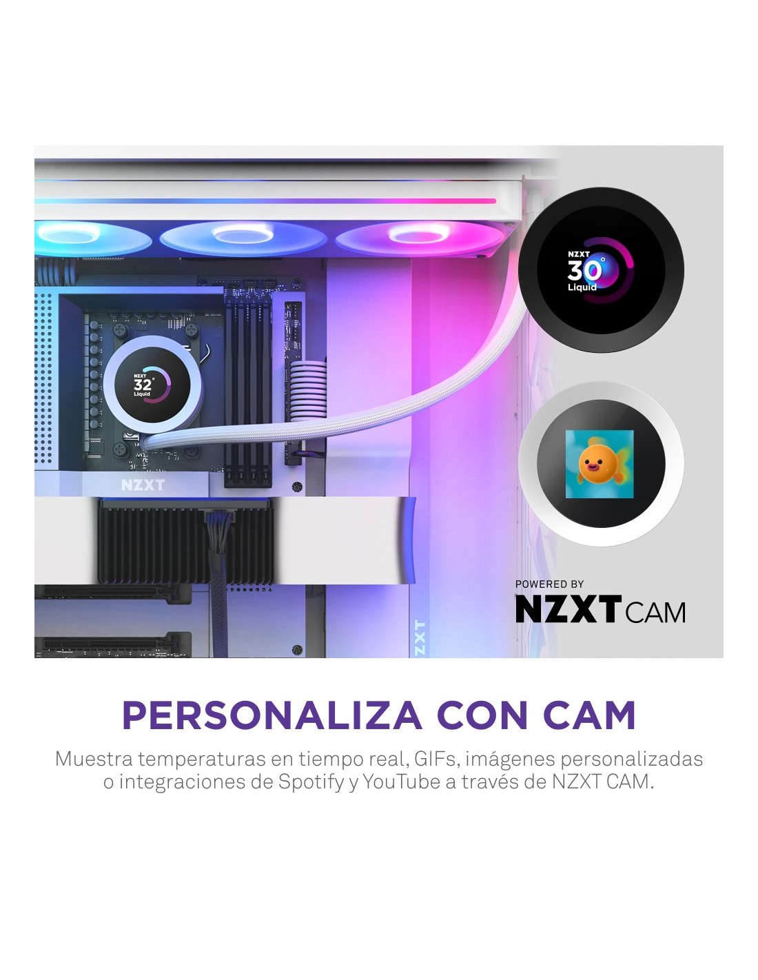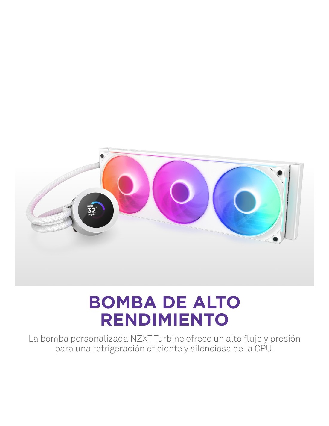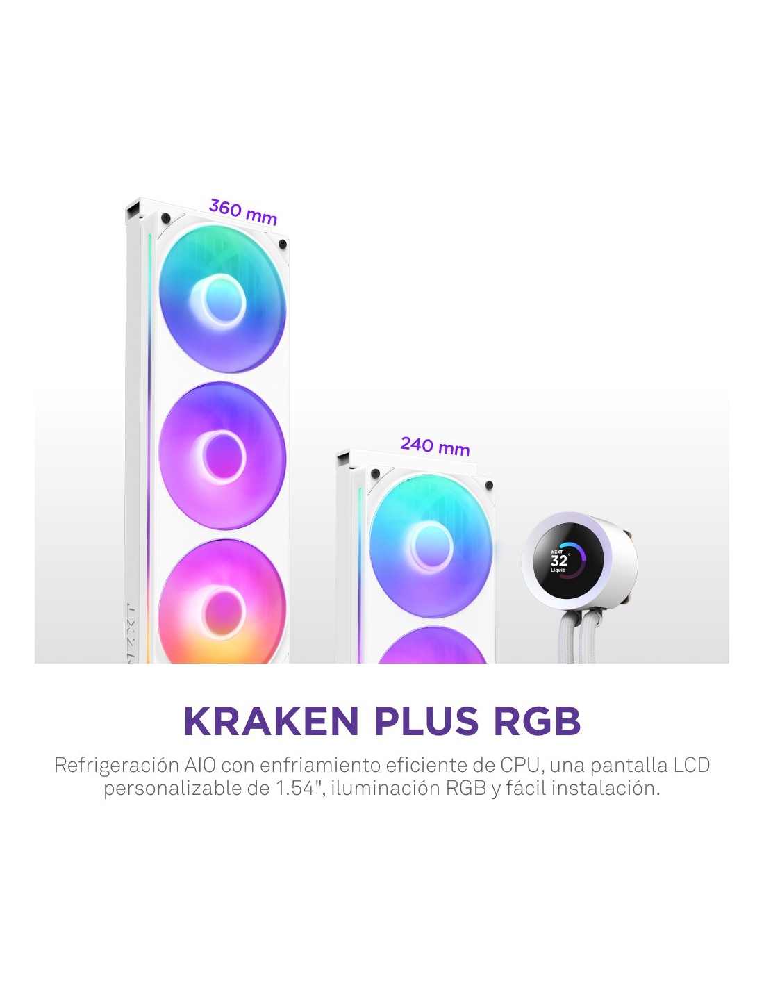 NZXT Kraken Plus 360 RGB. Tipo: Sistema de refrigeración líquida todo en uno, Velocidad de rotación (mín.): 500 RPM, Velocidad de rotación (máx.): 2400 RPM, Presión máxima de aire: 3,07 mmH2O, Tipo de soporte: Rodamiento dinámico fluido (FDB). Color del producto: Blanco