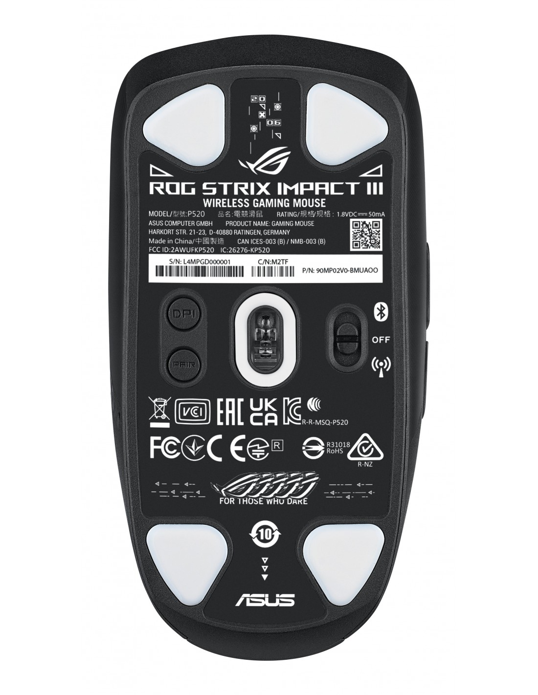 ASUS ROG Strix Impact III Wireless. Factor de forma: Ambidextro. Tecnología de detección de movimientos: Óptico, Interfaz del dispositivo: RF Wireless + Bluetooth, Resolución de movimiento: 36000 DPI, Tipo de botones: Botones presionados, Cantidad de botones: 6, Tipo de desplazamiento: Rueda, Aceleración (máx.): 50 G. Iluminación de color: Multi. Fuente de energía: Baterías. Color del producto: Negro