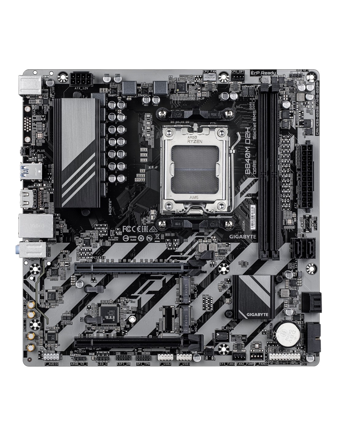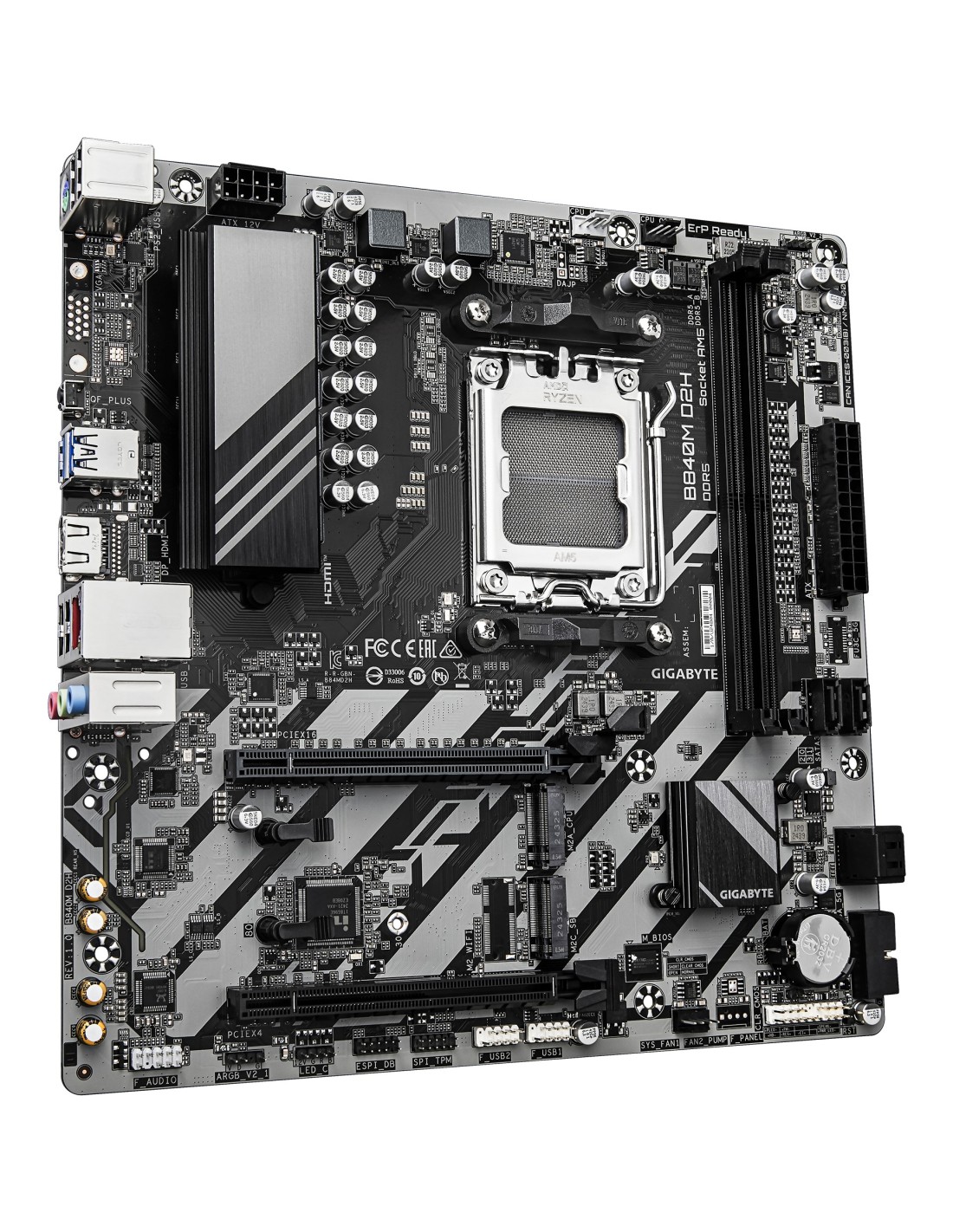 GIGABYTE B840M D2H Placa base - Procesadores AMD Ryzen 9000, VRM de 5+2+2 fases, hasta 7600 MHz DDR5, 1xPCIe 4.0 + 1xPCIe 3.0 M.2, LAN 2.5GbE, USB 3.2 Gen 1. Fabricante de procesador: AMD, Socket de procesador: Zócalo AM5, Procesador compatible: AMD Ryzen 7000 Series, AMD Ryzen 8000 Series, AMD Ryzen 9000 Series. tipos de memoria compatibles: DDR5-SDRAM, Memoria interna máxima: 128 GB, Tipo de ranuras de memoria: DIMM. Interfaces de disco de almacenamiento soportados: M.2, PCI Express 4.0, SATA III, Tipos de unidades de almacenamiento admitidas: HDD & SSD, Niveles RAID: 0, 1, 10. Máxima resolución: 4096 x 2160 Pixeles. Tipo de interfaz ethernet: 2.5 Gigabit Ethernet, Controlador LAN: Realtek RTL8125