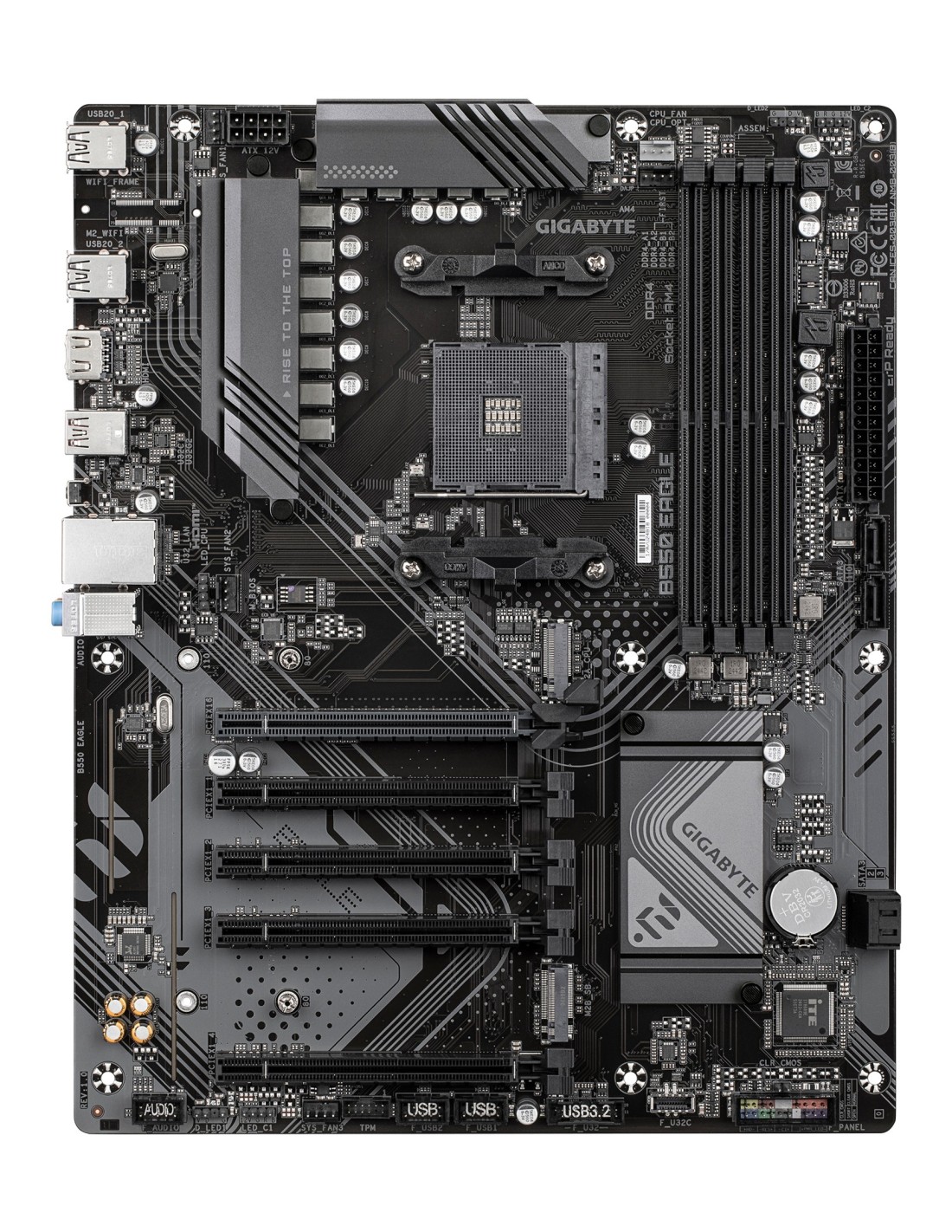 GIGABYTE B550 EAGLE Placa base - Procesadores AMD Ryzen serie 5000 G, VRM de 10+3+1 fases, hasta 3200 MHz DDR4, 1xPCIe 4.0 + 1xPCIe 3.0 M.2, LAN 1GbE, USB 3.2 Gen 2. Fabricante de procesador: AMD, Socket de procesador: Zócalo AM4, Procesador compatible: AMD Ryzen 3000 Series, AMD Ryzen 4000 Series, AMD Ryzen 5000 Series. tipos de memoria compatibles: DDR4-SDRAM, Memoria interna máxima: 128 GB, Tipo de ranuras de memoria: DIMM. Interfaces de disco de almacenamiento soportados: M.2, PCI Express 4.0, SATA III, Tipos de unidades de almacenamiento admitidas: HDD & SSD, Niveles RAID: 0, 1, 10. Máxima resolución: 4096 x 2160 Pixeles. Tipo de interfaz ethernet: Gigabit Ethernet, Controlador LAN: Realtek RTL8111H