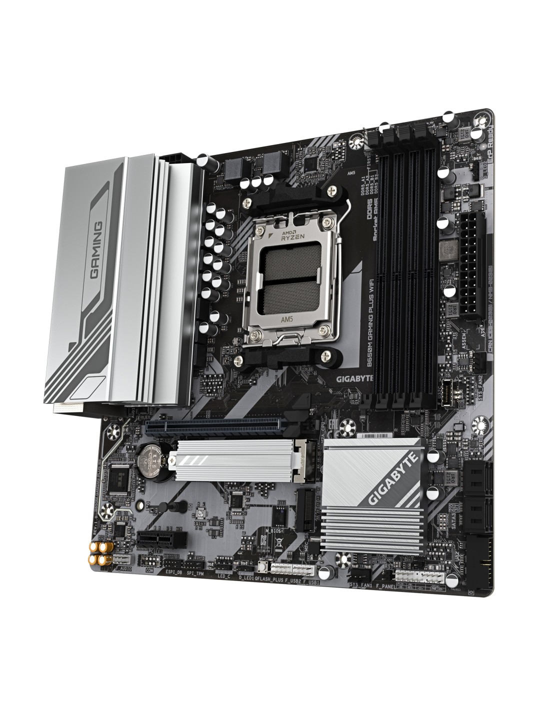 GIGABYTE B650M GAMING PLUS WIFI Placa base - Procesadores AMD Ryzen 9000, VRM de 5+2+2 fases, hasta 8000 MHz DDR5, 2xPCIe 4.0 M.2, LAN 2.5GbE, WIFI 6E, USB 3.2 Gen 1. Fabricante de procesador: AMD, Socket de procesador: Zócalo AM5, Procesador compatible: AMD Ryzen 7000 Series, AMD Ryzen 8000 Series, AMD Ryzen 9000 Series. tipos de memoria compatibles: DDR5-SDRAM, Memoria interna máxima: 256 GB, Tipo de ranuras de memoria: DIMM. Interfaces de disco de almacenamiento soportados: M.2, PCI Express 4.0, SATA III, Tipos de unidades de almacenamiento admitidas: HDD & SSD, Niveles RAID: 0, 1, 10. Máxima resolución: 4096 x 2160 Pixeles. Tipo de interfaz ethernet: 2.5 Gigabit Ethernet, Controlador LAN: Realtek RTL8125, Estándar Wi-Fi: Wi-Fi 6E (802.11ax)