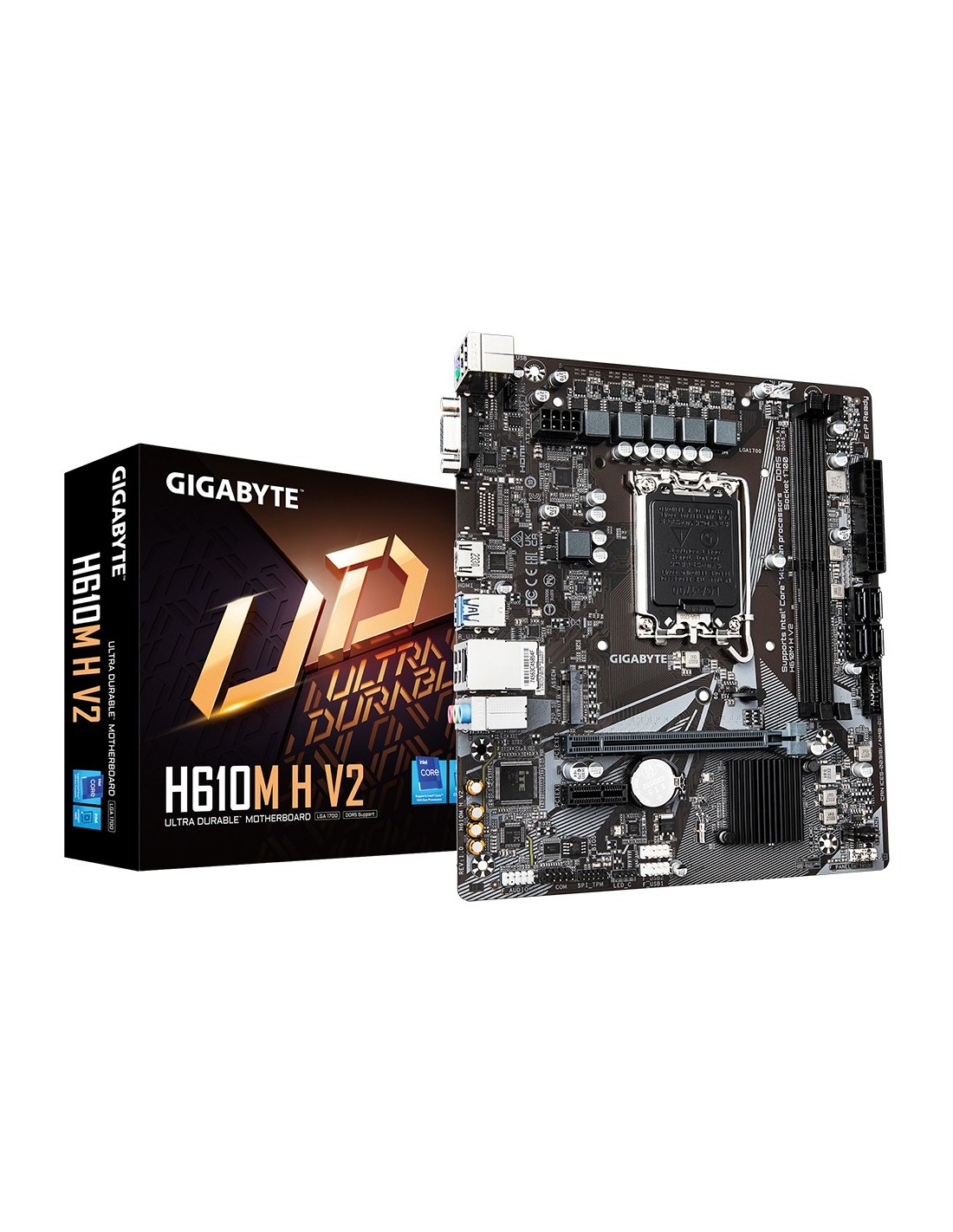 GIGABYTE H610M H V2 Placa base - Compatible con procesadores Intel Core 14th CPUs, 4+1+1 Hybrid Digital VRM, up to 5600MHz DDR5, 1xPCIe 3.0 M.2, GbE LAN, USB 3.2 Gen 1. Fabricante de procesador: Intel, Socket de procesador: LGA 1700, Procesador compatible: Intel® Celeron®, Intel® Core™ i3, Intel® Core™ i5, Intel® Core™ i7, Intel® Core™ i9,.... tipos de memoria compatibles: DDR5-SDRAM, Memoria interna máxima: 96 GB, Tipo de ranuras de memoria: DIMM. Interfaces de disco de almacenamiento soportados: M.2, SATA III, Tipos de unidades de almacenamiento admitidas: HDD & SSD. Graphics chipset: Intel, Adaptador gráfico: HD Graphics, Máxima resolución: 4096 x 2304 Pixeles. Conector USB: USB tipo A