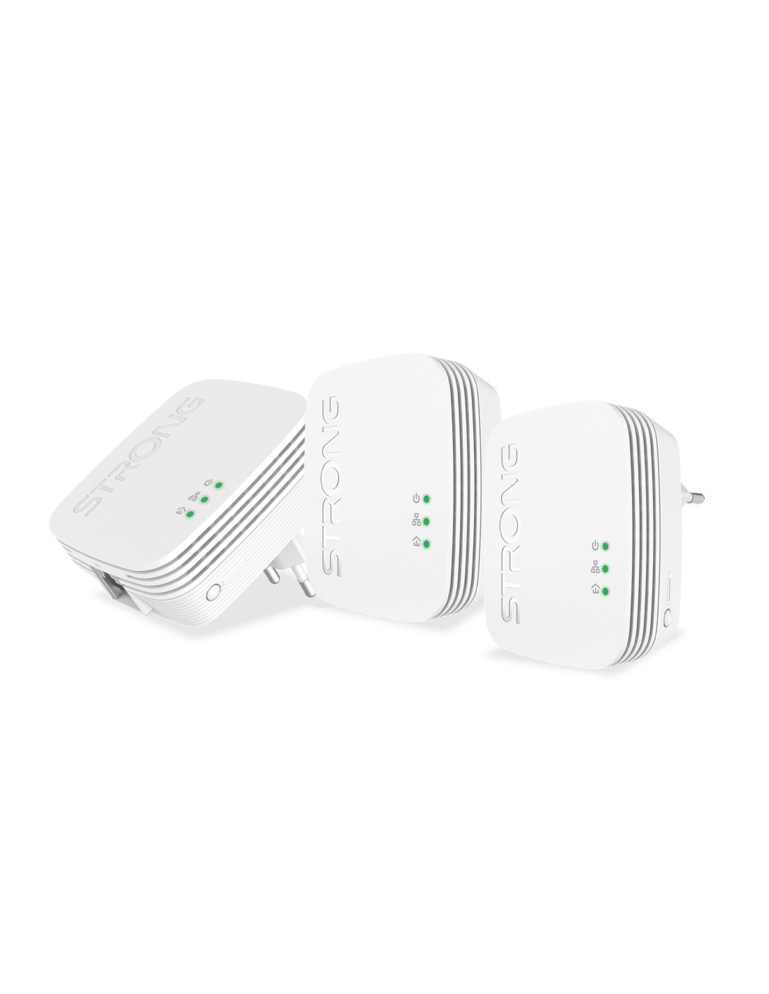 Strong Powerline 600 Triple Pack Mini. Rango máximo de transferencia de datos: 600 Mbit/s, Estándares de red: IEEE 802.3, IEEE 802.3u, Tipo de interfaz Ethernet LAN: Ethernet rápido. Voltaje de entrada AC: 100 - 240 V, Frecuencia de entrada AC: 50/60 Hz, Corriente: 16 A. Color del producto: Blanco. Sistema operativo Windows soportado: Windows 11, Windows 7, Windows 8, Windows 8.1. Ancho: 63 mm, Profundidad: 68 mm, Altura: 75 mm
