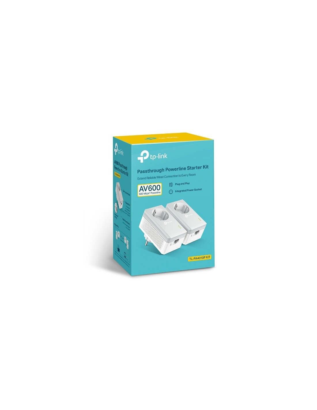 TP-Link TL-PA4010P KIT V5. Rango máximo de transferencia de datos: 600 Mbit/s, Estándares de red: IEEE 802.3, IEEE 802.3u, Tipo de interfaz Ethernet LAN: Ethernet rápido. Consumo energético: 4,6 W, Consumo de energía (inactivo): 0,72 W. Color del producto: Blanco, Certificación: FCC, CE. Ancho: 95 mm, Profundidad: 58 mm, Altura: 42 mm. Cantidad por paquete: 2 pieza(s), Cables incluidos: LAN (RJ-45)