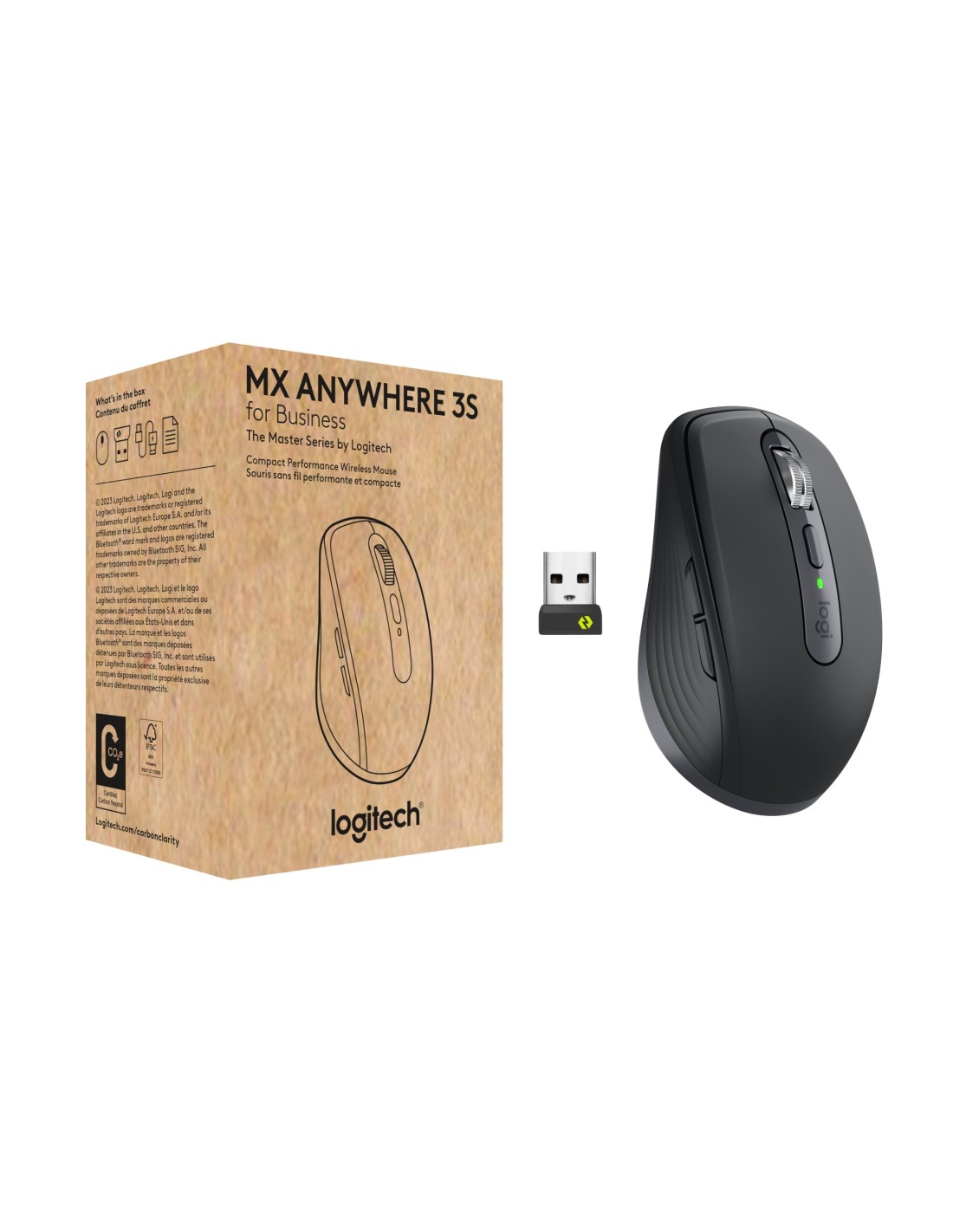 Logitech MX Anywhere 3S for Business. Factor de forma: mano derecha. Tecnología de detección de movimientos: Laser, Interfaz del dispositivo: RF Wireless + Bluetooth, Resolución de movimiento: 8000 DPI, Tipo de botones: Botones presionados, Cantidad de botones: 6, Tipo de desplazamiento: Rueda. Fuente de energía: Baterías. Color del producto: Grafito
