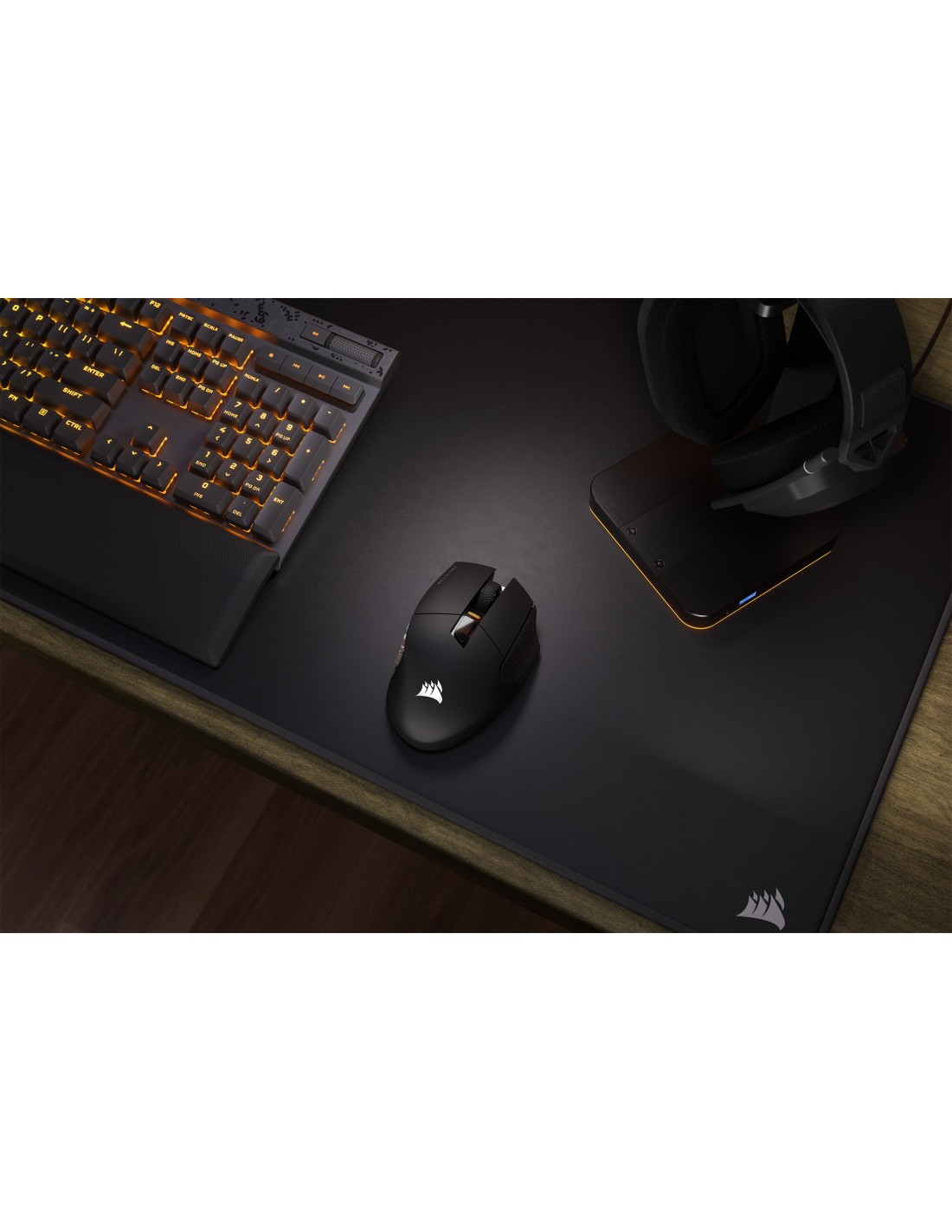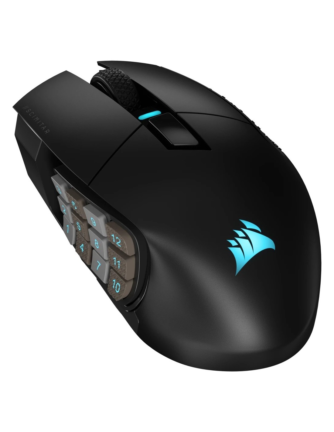 Corsair SCIMITAR ELITE WIRELESS. Factor de forma: mano derecha. Tecnología de detección de movimientos: Óptico, Interfaz del dispositivo: RF Wireless + Bluetooth + USB Type-C, Resolución de movimiento: 26000 DPI, Tiempo de respuesta: 1 ms, Tipo de botones: Botones presionados, Cantidad de botones: 16, Tipo de desplazamiento: Rueda, Aceleración (máx.): 50 G. Iluminación de color: Multi. Fuente de energía: Baterías/Cable. Color del producto: Negro