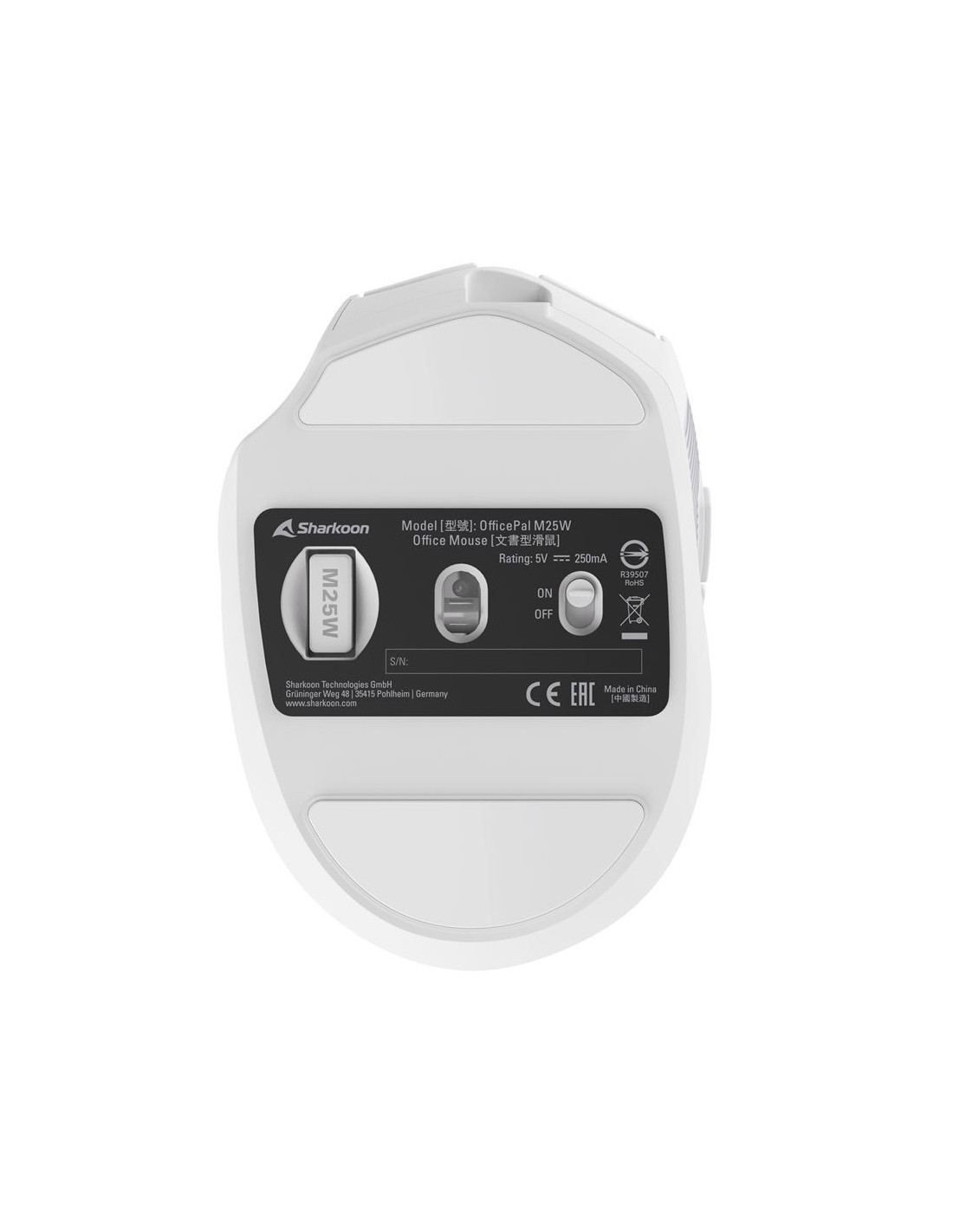 Sharkoon OfficePal M25W. Factor de forma: mano derecha. Tecnología de detección de movimientos: Óptico, Interfaz del dispositivo: RF Wireless + USB Type-C, Resolución de movimiento: 4000 DPI, Tipo de botones: Botones presionados, Cantidad de botones: 6, Tipo de desplazamiento: Rueda, Aceleración (máx.): 15 G. Iluminación de color: Multi. Fuente de energía: Baterías/Cable. Color del producto: Blanco