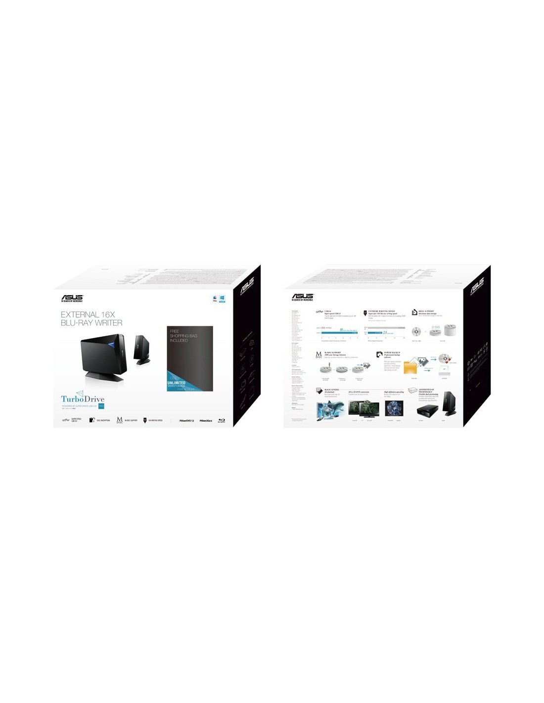 ASUS BW-16D1H-U PRO. Color del producto: Negro, Tipo de carga en disco: Bandeja, Montaje: Vertical/Horizontal. Utilizar con: Sobremesa/Portátil, Tipo de unidad óptica: Blu-Ray DVD Combo, Interfaz: USB 3.2 Gen 1 (3.1 Gen 1). DVD+R, velociad de escritura: 16x, CD-R, velocidad de escritura: 48x, CD-RW, velocidad de escritura: 24x. CD-R, velocidad de lectura: 48x, CD-RW, velocidad de lectura: 40x, CD-ROM, velocidad de lectura: 48x. DVD, tiempo promedio de acceso: 170 ms, Unidad CD-ROM tiempo promedio de acceso: 150 ms, BD-ROM tiempo promedio de acceso aleatorio: 180 ms