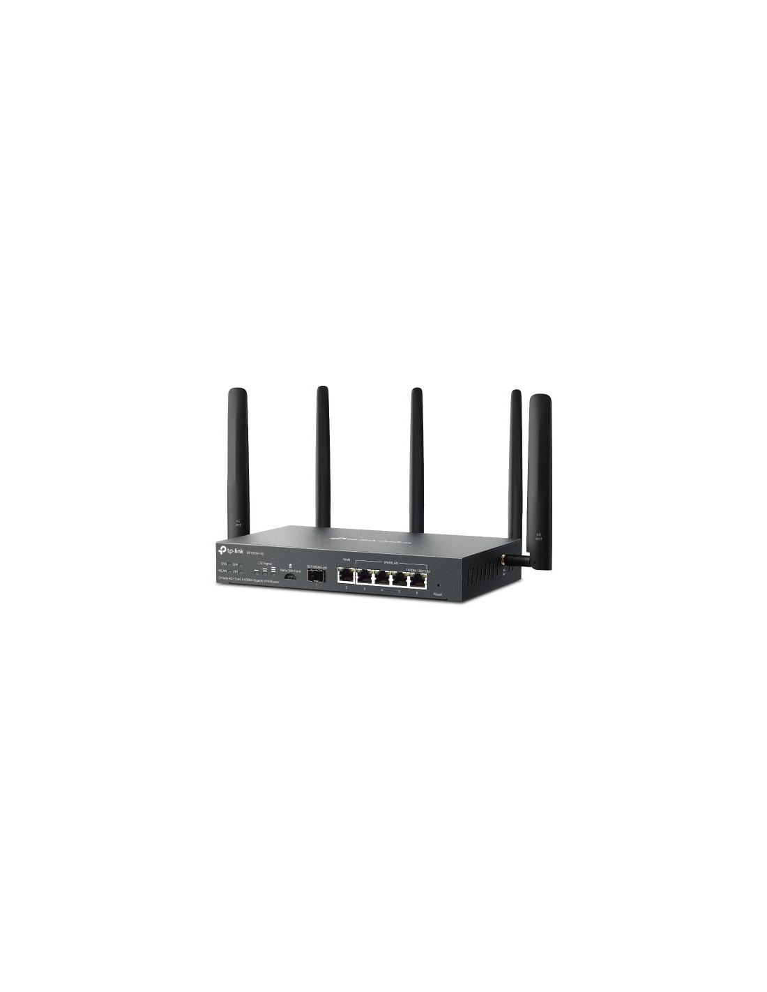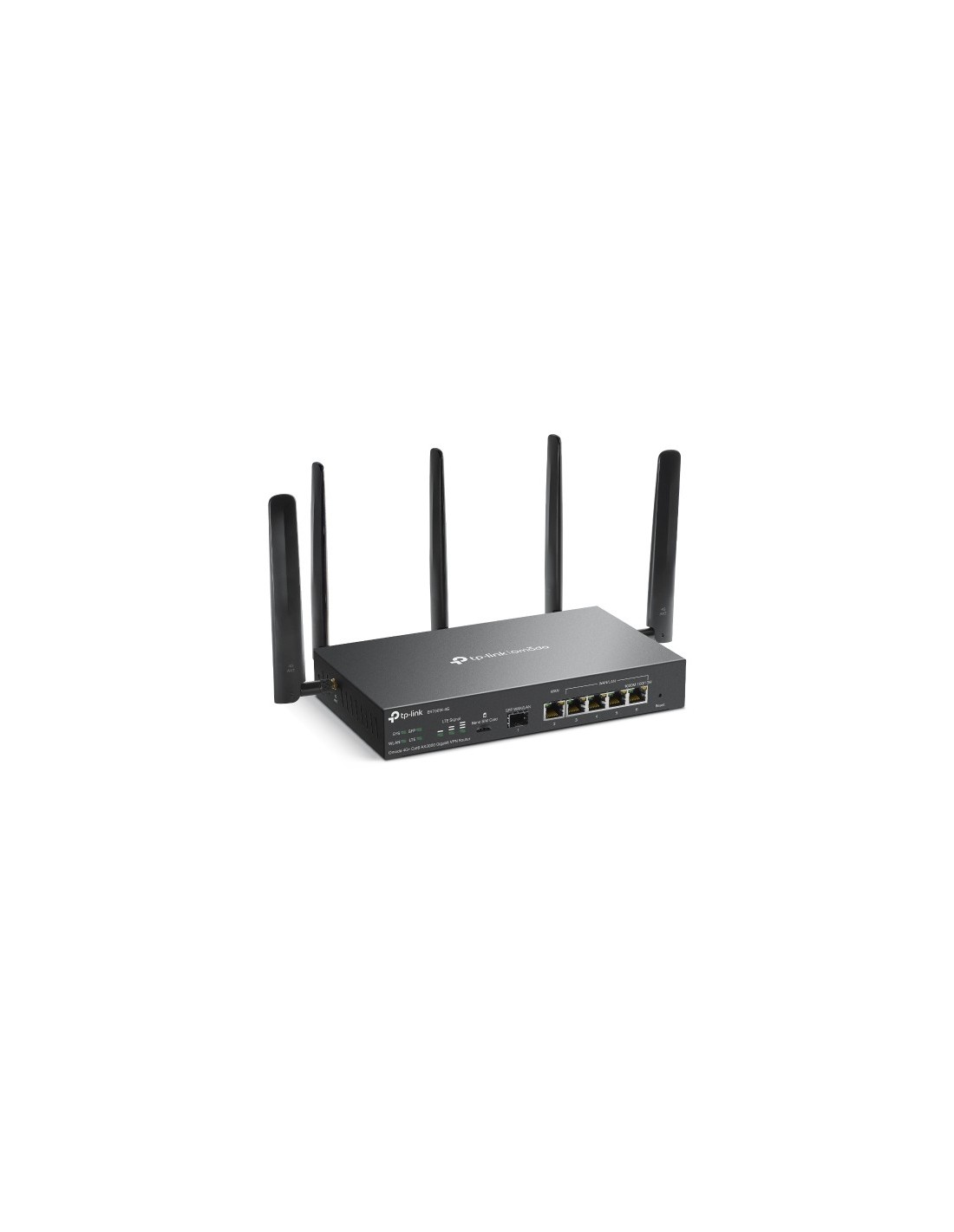 TP-Link Omada ER706W-4G. Banda Wi-Fi: Doble banda (2,4 GHz / 5 GHz), Estándar Wi-Fi: Wi-Fi 6 (802.11ax), Tasa de transferencia de datos WLAN (máx.): 2402 Mbit/s. Tipo de interfaz Ethernet LAN: Gigabit Ethernet. Generación de red móvil: 4G, Estándares 3G: HSDPA, HSUPA, WCDMA, Estándar 4G: LTE-TDD & LTE-FDD. NAT, funcionalidad: • One-to-One NAT • Multi-Net NAT • Virtual Server • Port Triggering† • NAT-DMZ •.... Tipo de producto: Enrutador de escritorio/poste, Color del producto: Negro, Indicadores LED: LAN, LTE, Estado, Sistema, WAN